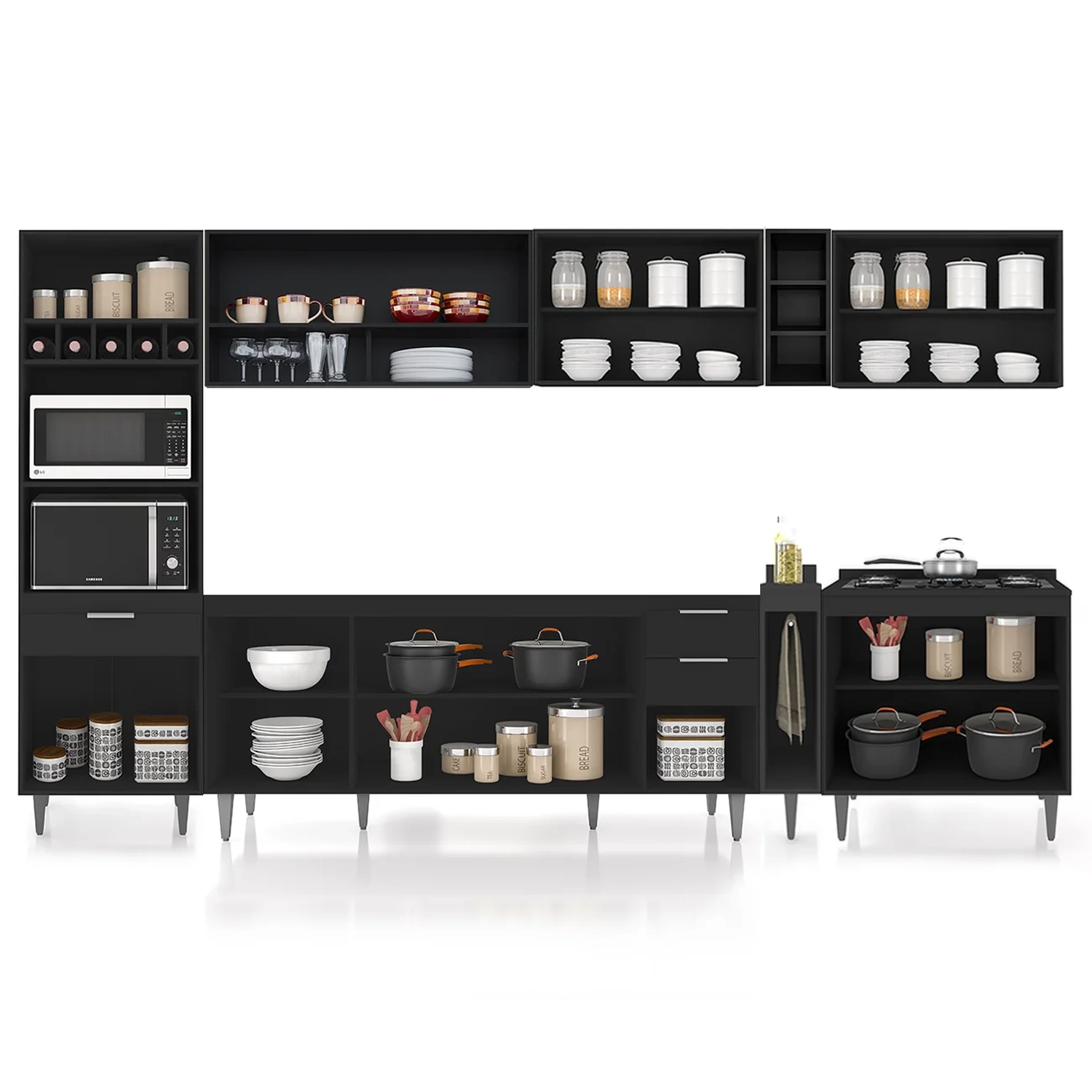 O Paneleiro conta com dois compartimentos para acomodar micro-ondas e forno elétrico, e cinco nichos na parte superior. Ele também inclui três portas, sendo uma delas basculante, além de uma gaveta para melhor organização dos seus utensílios. Os Armários Aéreos dispõe de quatro portas convencionais, uma porta basculante com pistão a gás, dois nichos e duas prateleiras internas, agregando praticidade e estilo. O Balcão Para Pia e o Balcão 80cm com Tampo possuem seis portas e duas gavetas, com duas prateleiras internas que oferecem amplo espaço de armazenamento. Já o Balcão Porta Pano traz um suporte de aço para guardanapos e o nicho adega que conta com três repartições. Todos os móveis possuem estrutura em MDP 15mm, com acabamento em BP, puxadores em alumínio, dobradiças e corrediças metálicas, que garantem máxima resistência no uso diário. Os pés em PVC, são reguláveis, permitindo ajustar pequenos desníveis de piso. O balcão gabinete não acompanha tampo para que o uso fique opcional com tampo ou pia. Este Armário de Cozinha é a solução ideal para otimizar sua casa, combinando materiais de alta qualidade com um design sofisticado.