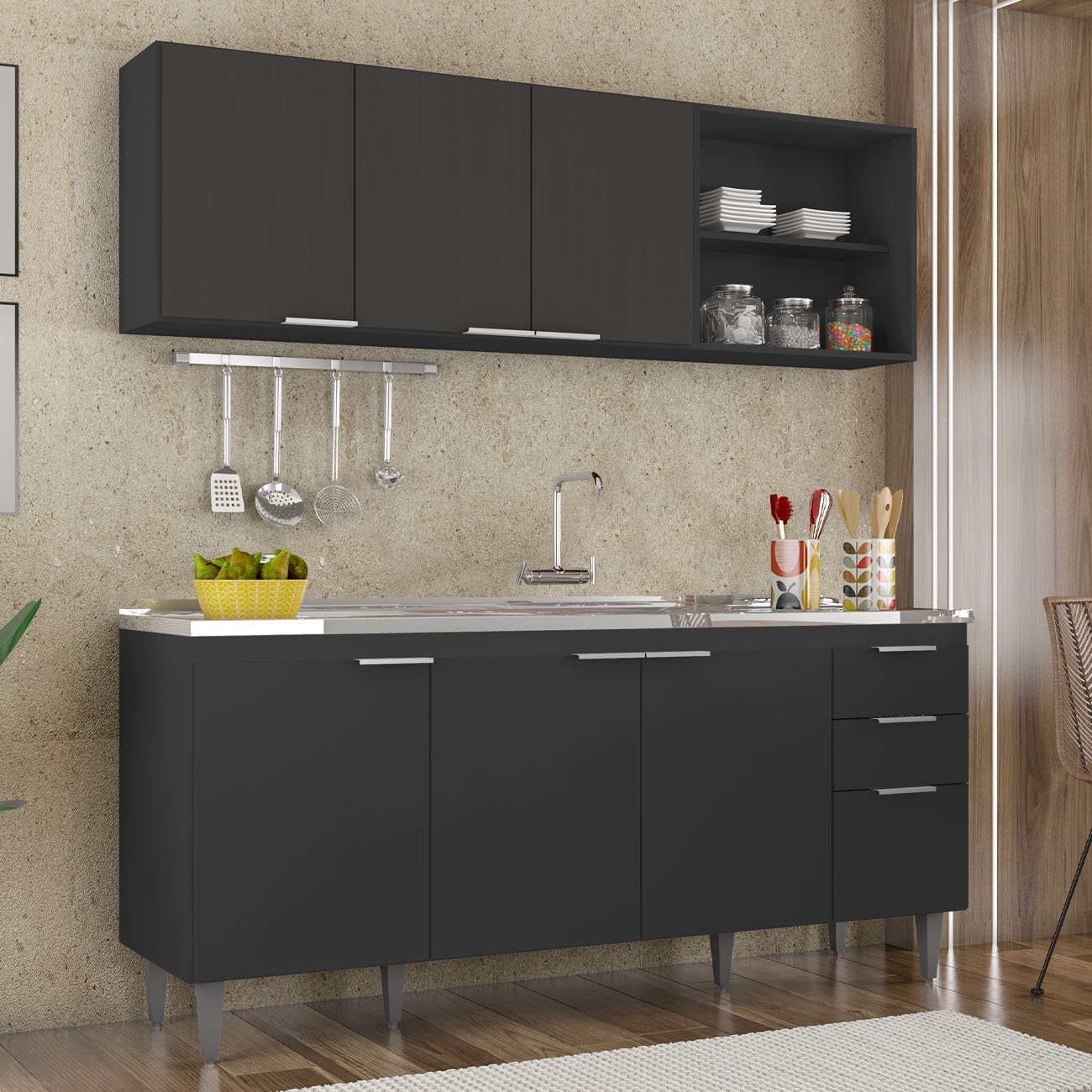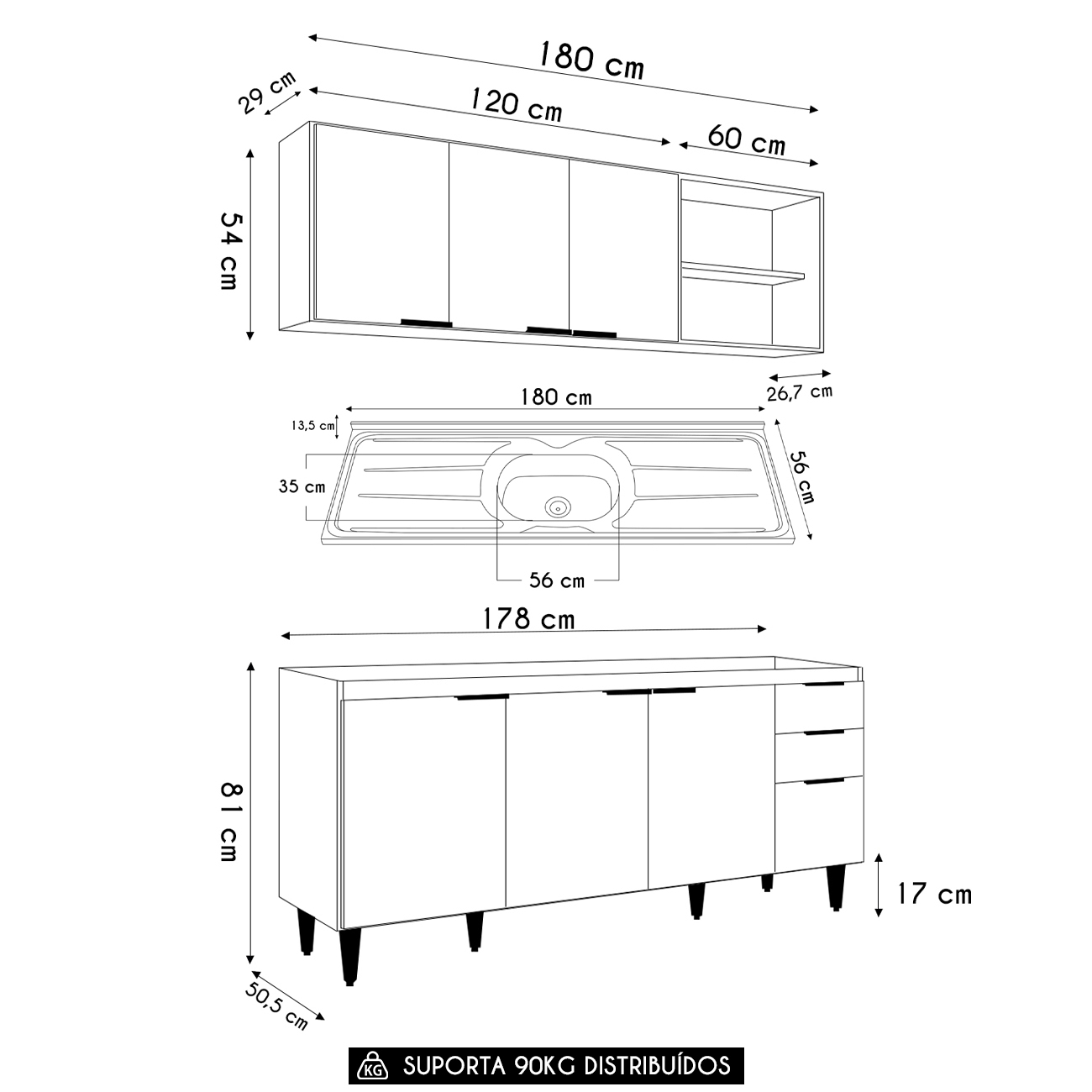 Conteúdo da Embalagem: 1 Armário Aéreo 120cm, 1 Armário Aéreo 60cm, 1 Balcão, 1 Pia.