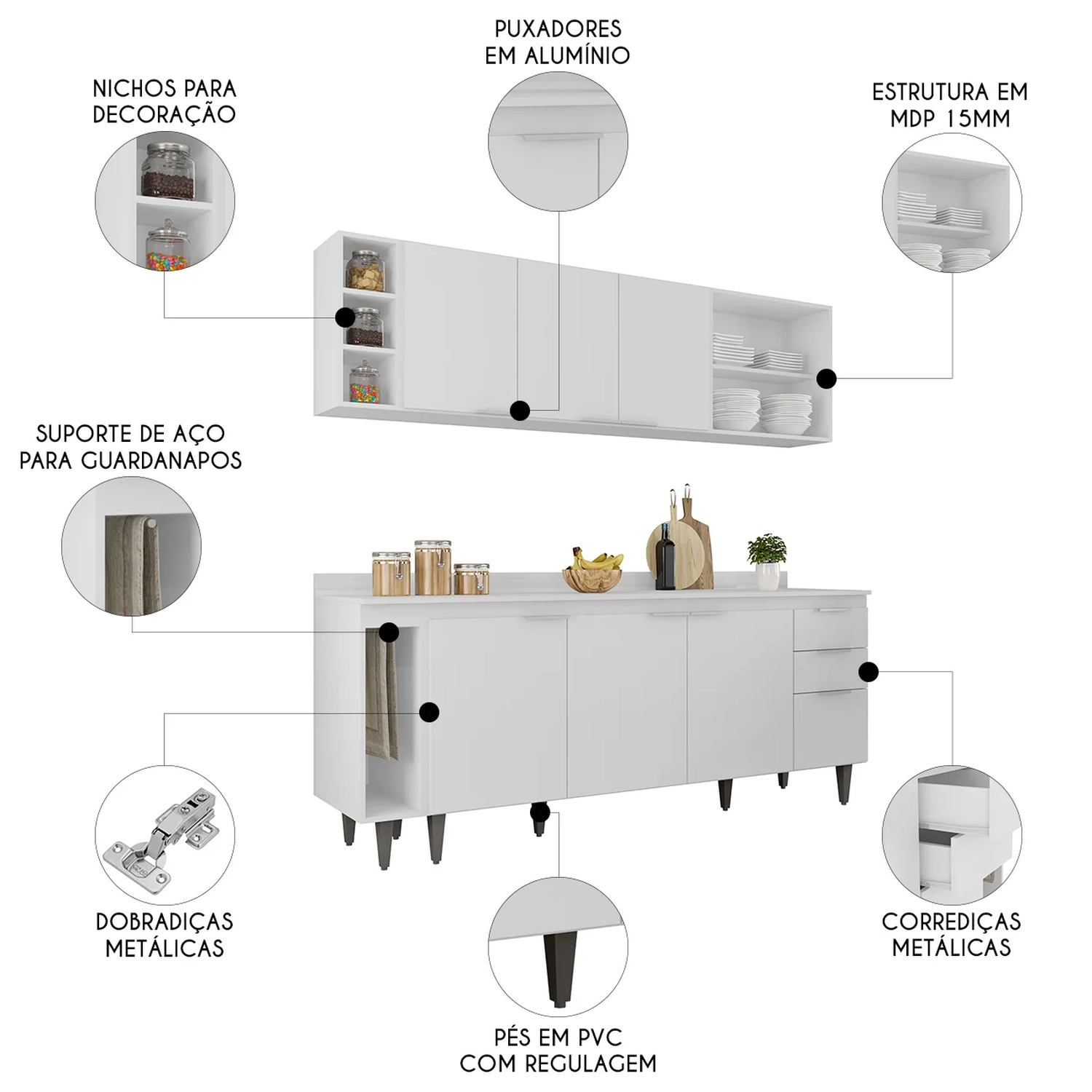 O Armário Aéreo 120cm vem com três portas e uma prateleira interna, para melhor organização dos seus utensílios. O Armário Aéreo 60cm conta com dois nichos, oferecendo praticidade e estilo. O Balcão Para Pia dispõe de quatro portas e duas gavetas, além de uma prateleira interna, que proporciona amplo espaço de armazenamento. Já o Balcão Porta Pano traz um suporte de aço para guardanapos, enquanto o nicho adega conta com três repartições e ambos podem ser montados ao lado esquerdo ou direito. Todos os móveis possuem estrutura em MDP 15mm, com acabamento em BP, puxadores em alumínio, dobradiças e corrediças metálicas, que garantem máxima resistência no uso diário. O tampo serve como apoio para eletrodomésticos ou no preparo dos alimentos, e o rodatampo que é um excelente acabamento entre o balcão e a parede. Os pés em PVC, são reguláveis, permitindo ajustar pequenos desníveis de piso. Este Armário de Cozinha é a solução ideal para otimizar sua casa, combinando materiais de alta qualidade com um design sofisticado.