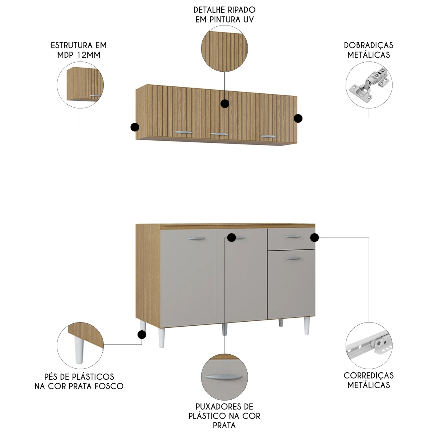 Conteúdo da Embalagem: 1 Armário Aéreo, 1 Balcão de Cozinha.