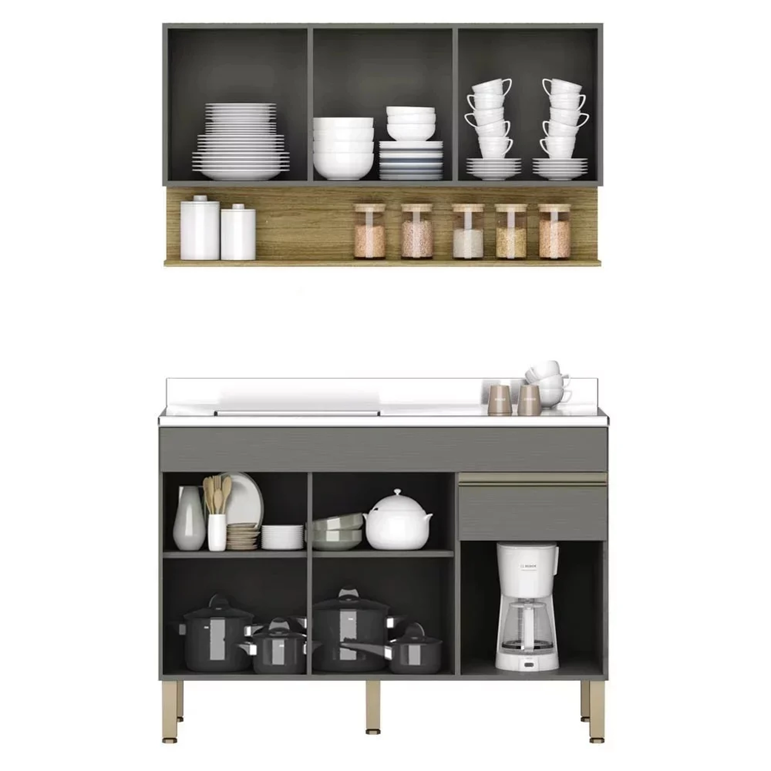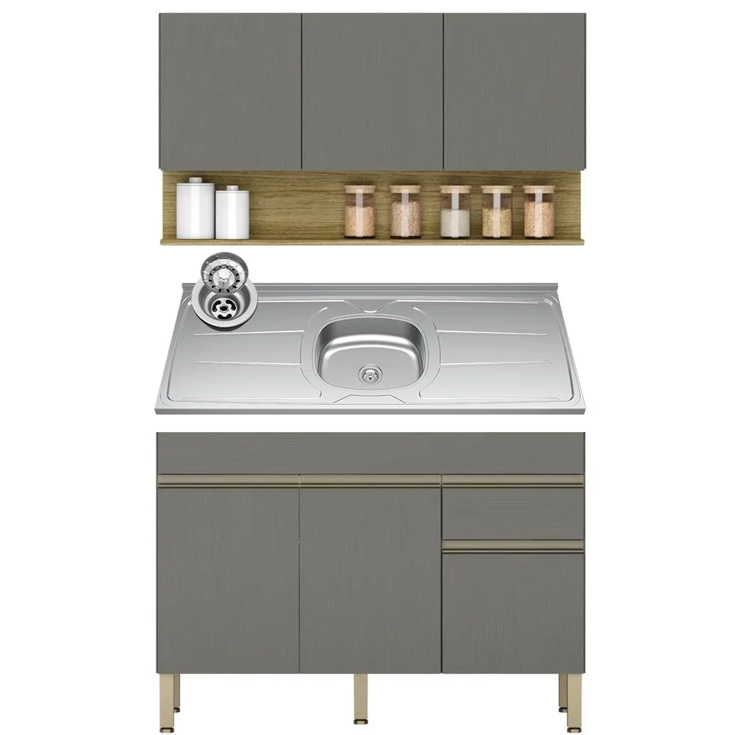Conteúdo da Embalagem: 1 Balcão, 1 Armário Aéreo, 1 Pia Inox.
