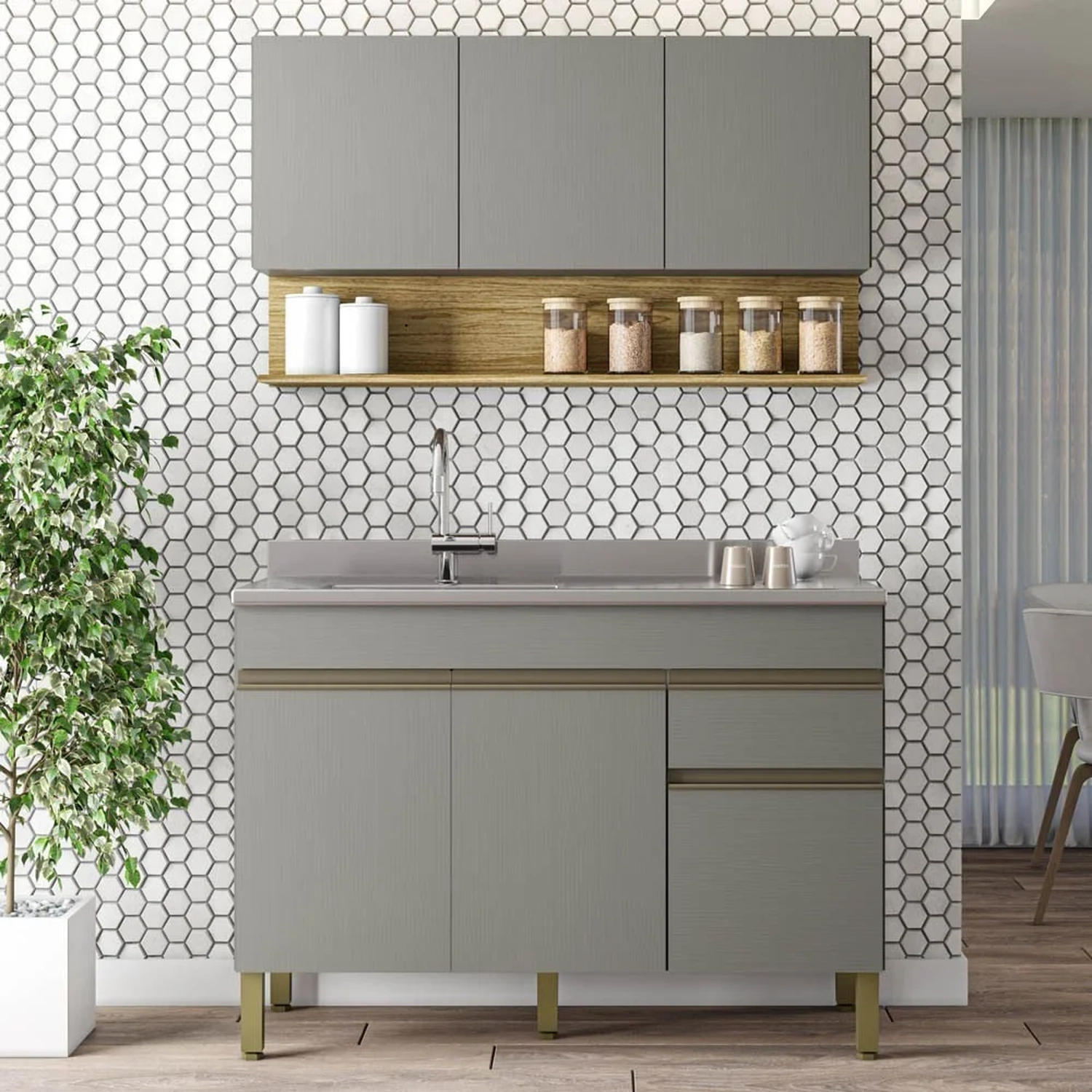 Conheça o Armário de Cozinha e Balcão com Pia 150cm Lina Z06 Gris, da Mpozenato, perfeito para você que quer renovar a sua cozinha deixando mais moderna e funcional!