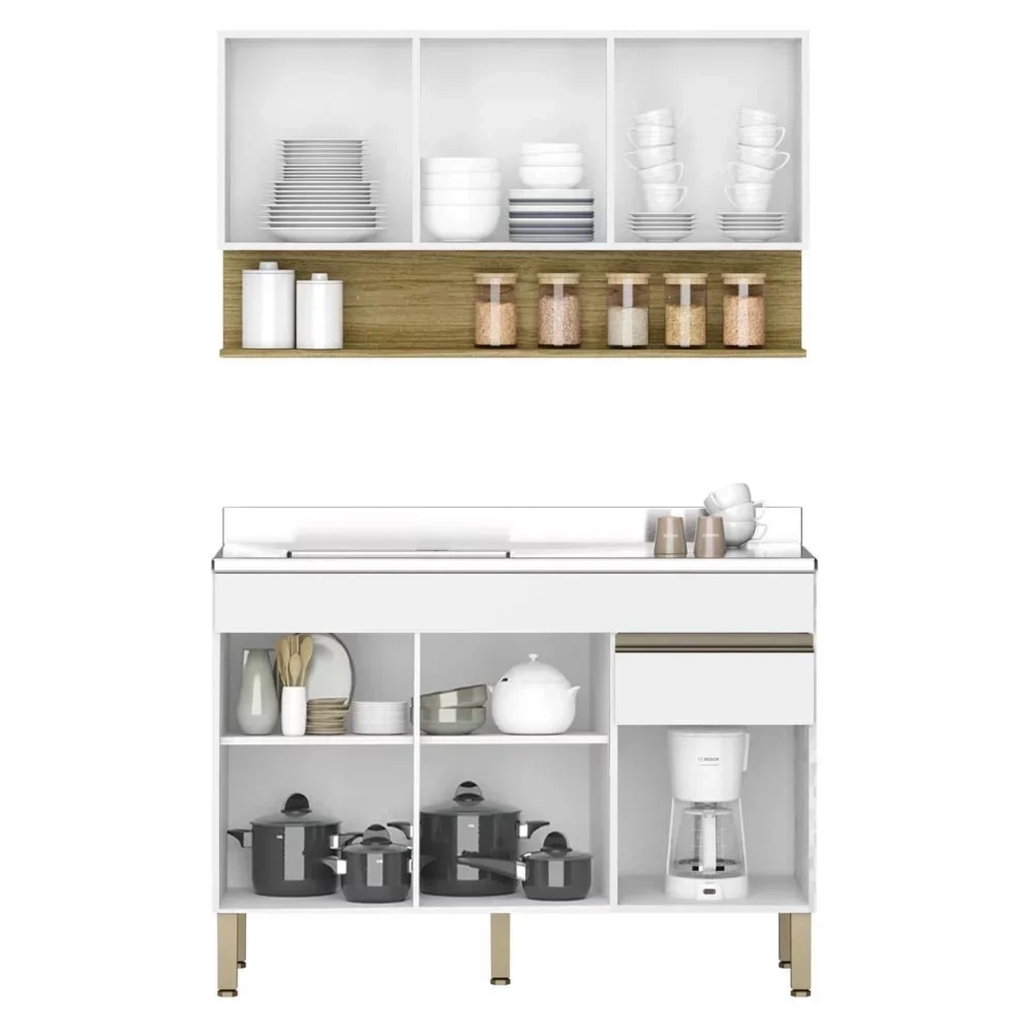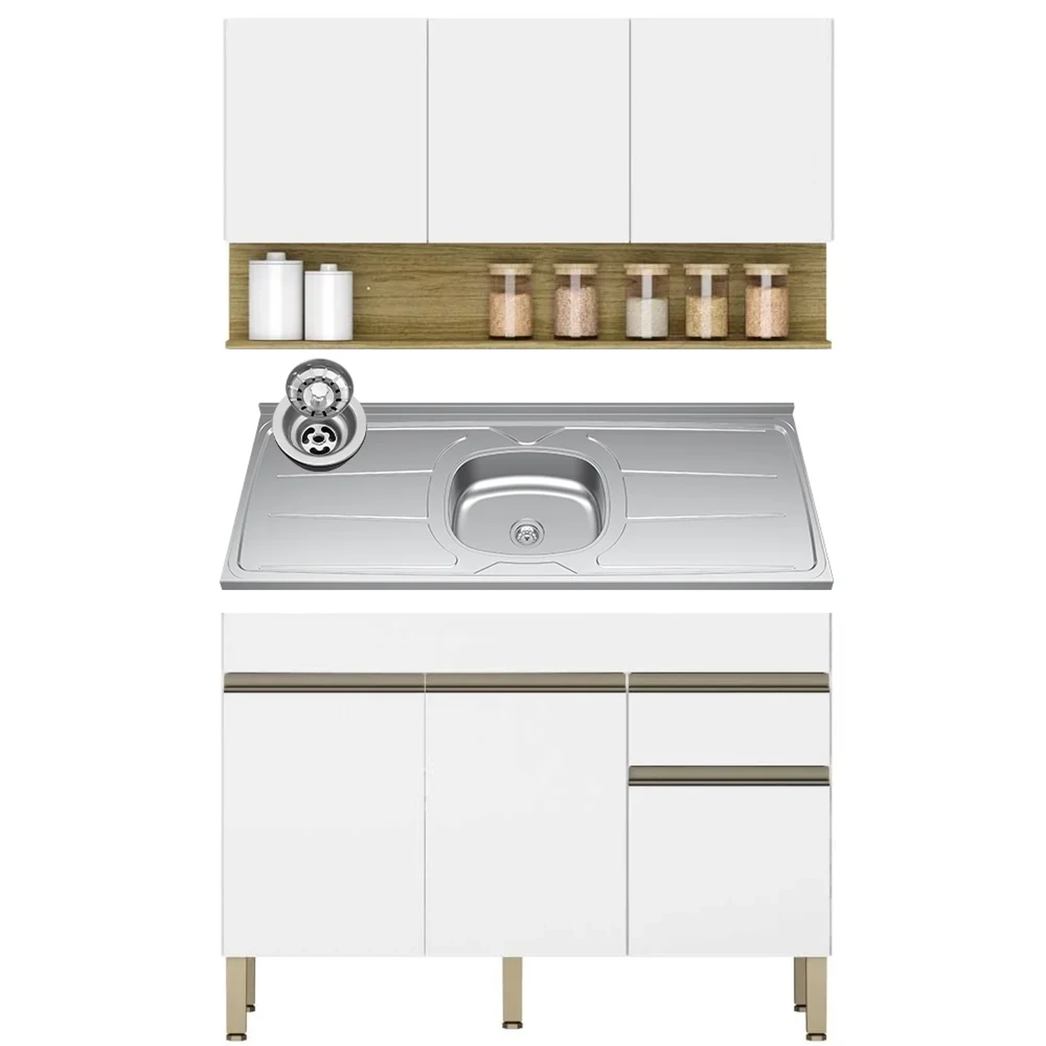 Conteúdo da Embalagem: 1 Balcão, 1 Armário Aéreo, 1 Pia Inox.