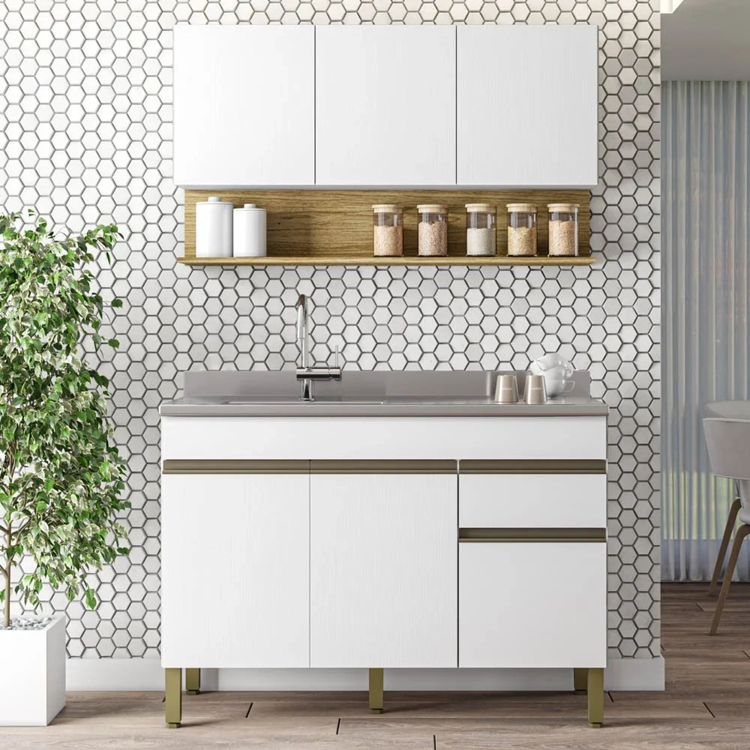 Ambos produzidos em MDP de alta qualidade, com acabamento em pintura UV que protege contra riscos e desgastes. O Armário Aéreo tem 3 portas, sendo maior que a estrutura do armário para que seja possível a abertura sem puxador e um nicho para você colocar objetos decorativos ou utensílios. O Balcão Gabinete tem 3 portas e 1 gaveta com corrediças telescópicas que deslizam suavemente, e com puxadores em alumínio. O balcão já vem com Pia Inox, cuba e válvula. Esse armário é fácil de montar e de limpar, e tem um design elegante e sofisticado que vai valorizar o seu ambiente.