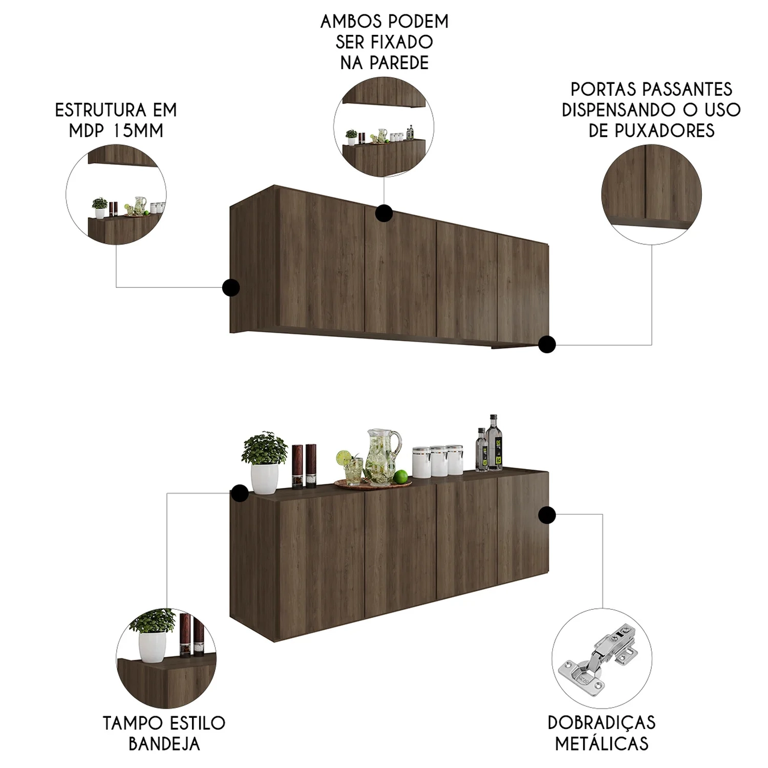 A verdadeira flexibilidade está na possibilidade de uso, podendo instalar um como balcão suspenso e o outro como armário aéreo, aproveitando ao máximo o espaço disponível, seja ele superior ou inferior. Uma opção perfeita para quem tem uma Cozinha Compacta e precisa de um aproveitamento inteligente do espaço.