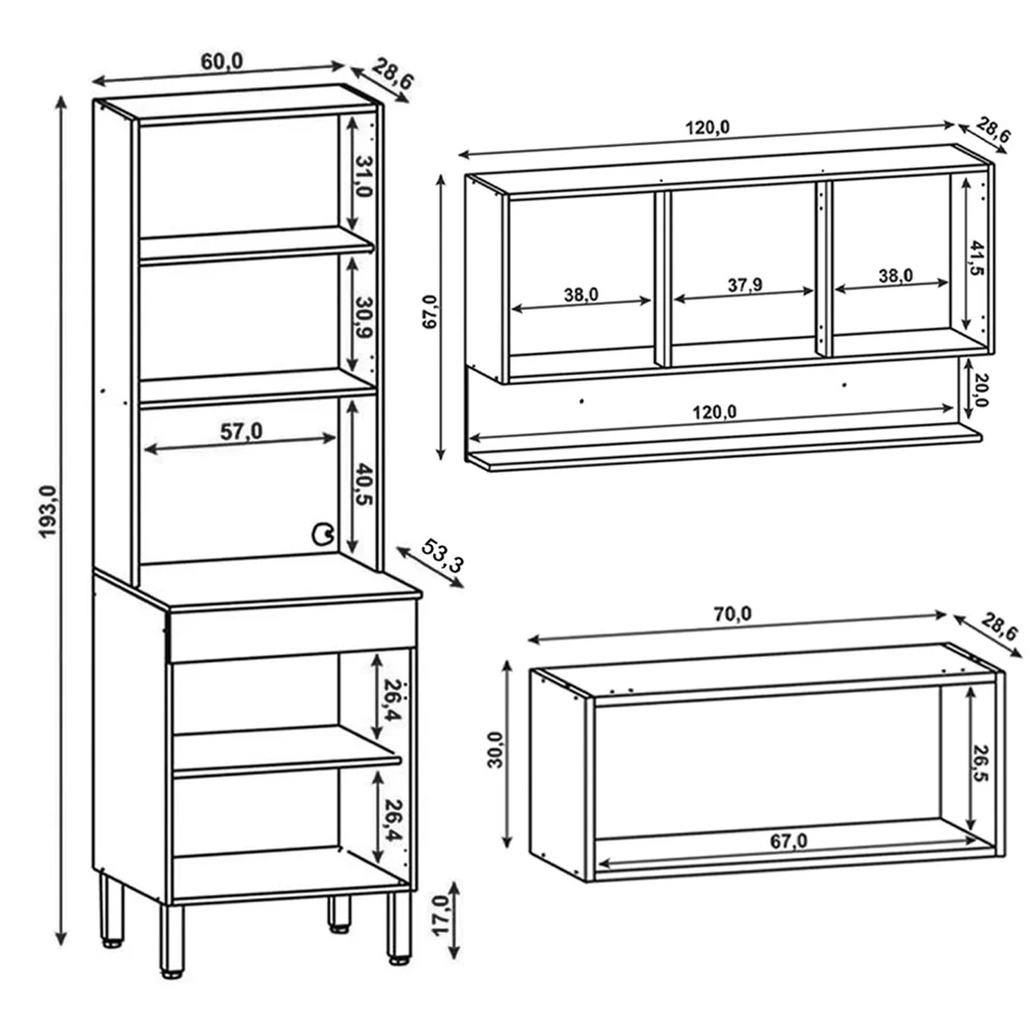 Armário Aéreo 70cm: 70 x 30 x 28,6 cm.