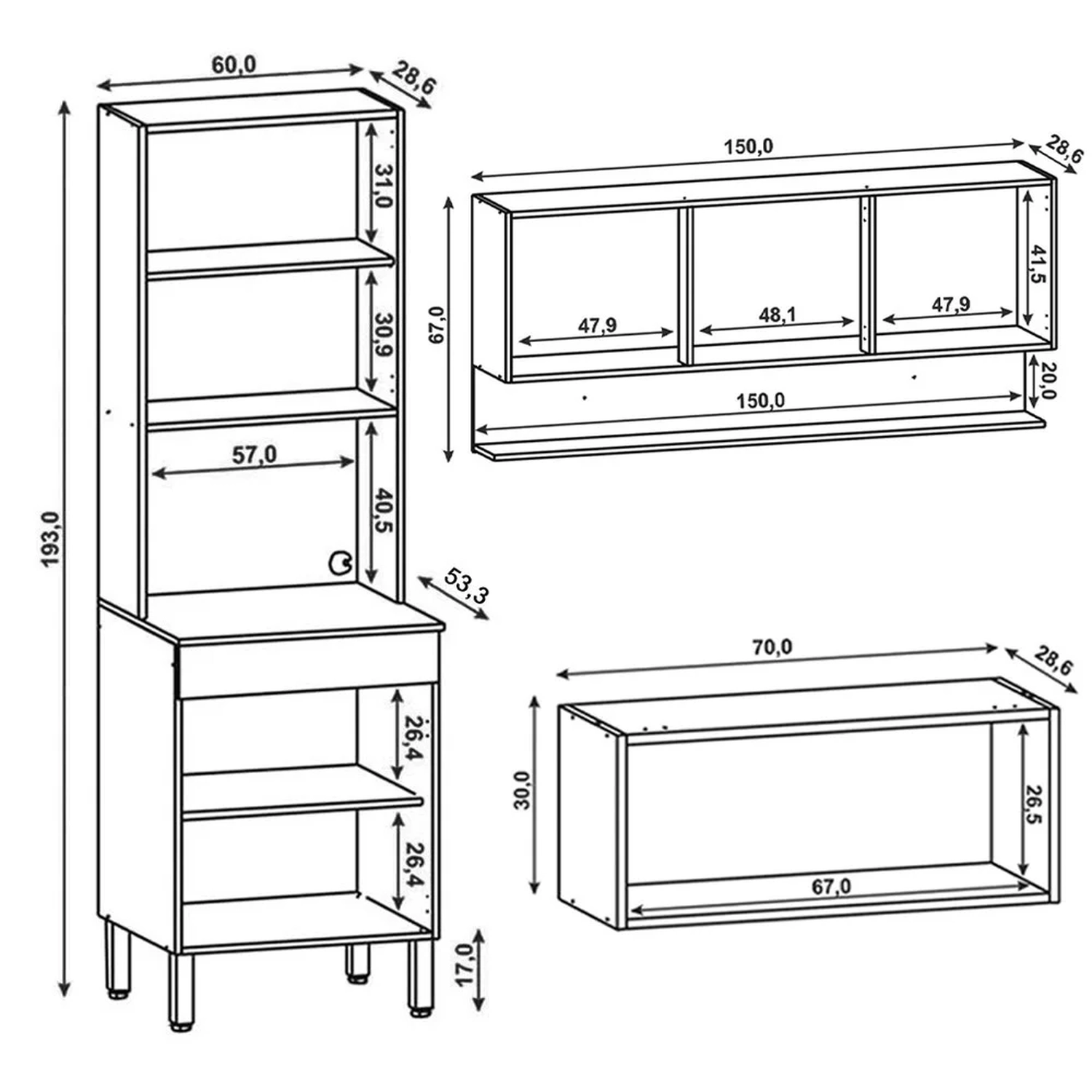 Conteúdo da Embalagem: 1 Armário Aéreo 150cm, 1 Armário Aéreo 70cm, 1 Paneleiro.