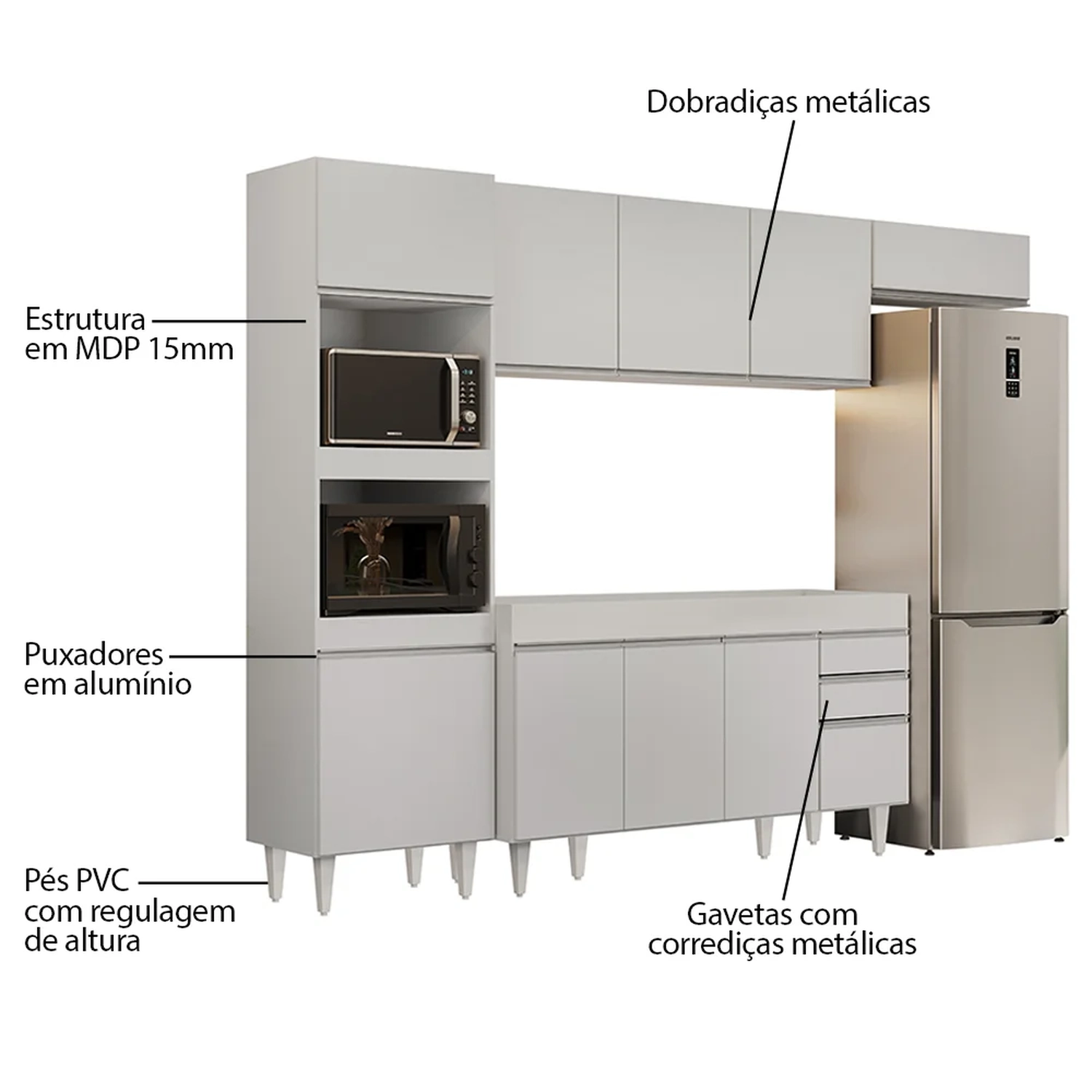 Com esse Kit de Cozinha, você vai contar com 1 Paneleiro com espaço para micro-ondas e forno elétrico, 1 Armário Aéreo 150cm 3 portas, 1 Armário Aéreo 70cm 1 porta basculante e 1 Balcão 150cm sem Tampo 4 portas e 2 gavetas com corrediças metálicas, que deslizam suavemente. Além disso, possui puxadores em alumínio, agregando sofisticação ao ambiente e os pés em PVC são reguláveis, perfeitos para corrigir pequenos desníveis de piso.