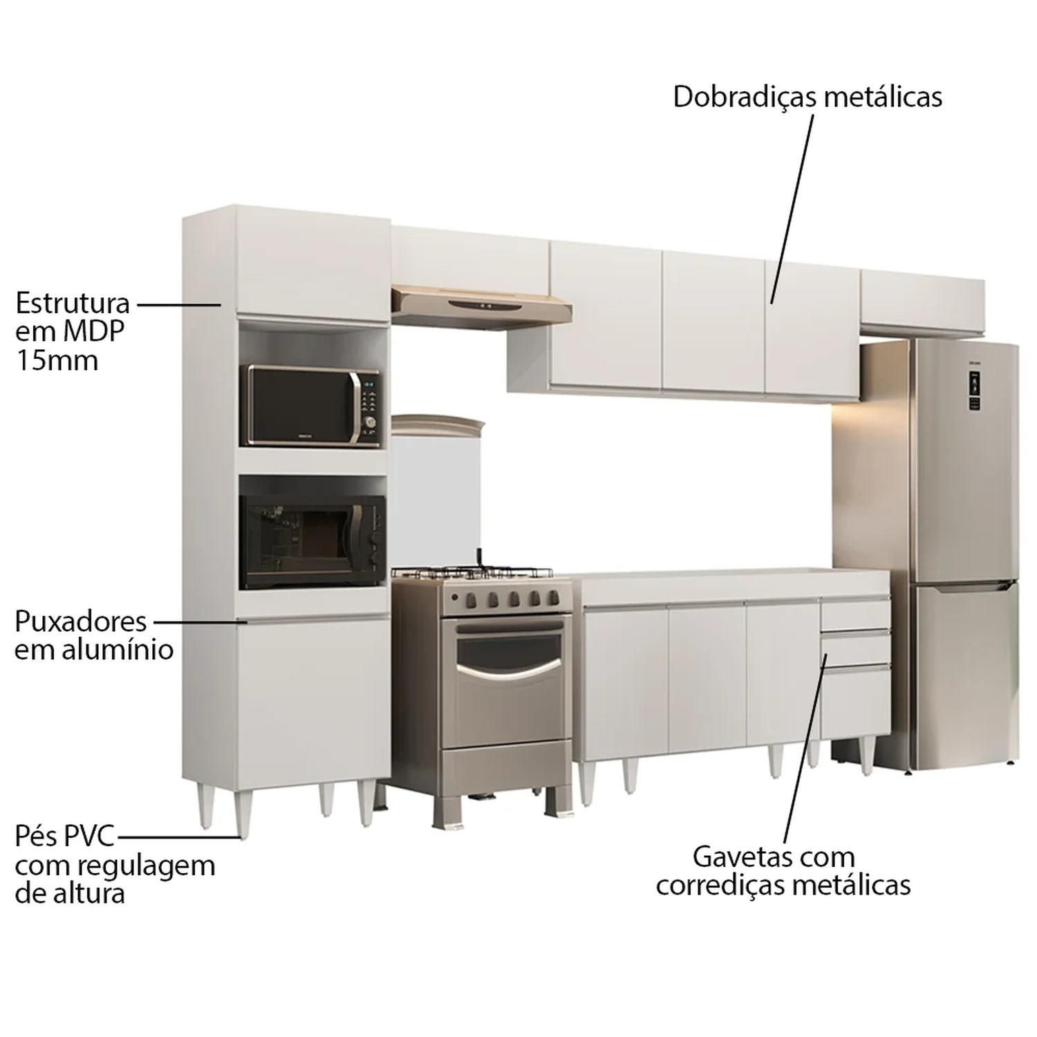 Conteúdo da Embalagem: 1 Balcão 150cm, 1 Armário Aéreo 150cm, 2 Armários Aéreos 70cm, 1 Paneleiro.