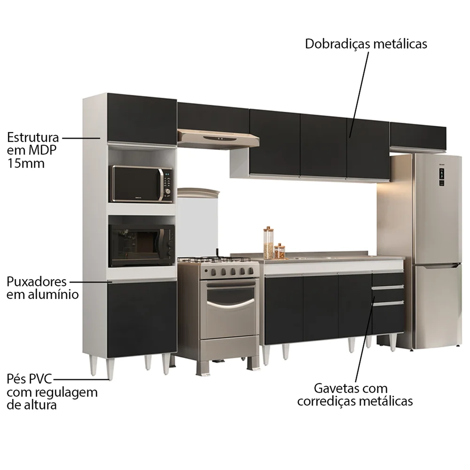 Conhecido pela praticidade e beleza, o Armário de Cozinha Modulada 5 Peças CP15 com Pia Inox Branco/Preto, da Lumil é o que você precisa para compor a sua Cozinha, confira!