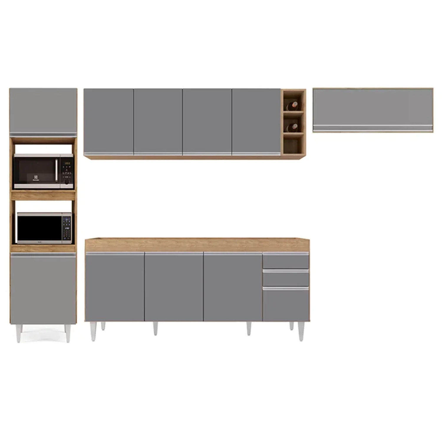 Com esse Kit para Cozinha, você vai contar com 1 Balcão 180cm sem tampo 4 portas 2 gavetas, 1 Paneleiro com espaço para micro-ondas e forno elétrico, 1 Armário 70cm com porta basculante, 1 Armário aéreo 160cm e 1 Nicho garrafeiro. A vantagem dos módulos é que você personalize o seu espaço, pois você pode escolher a disposição de cada móvel de acordo com a sua necessidade e preferência!