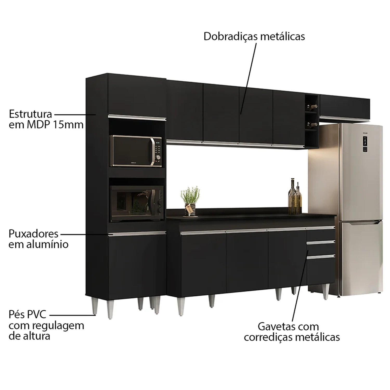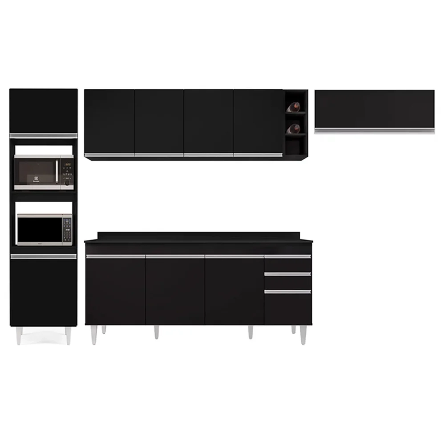 Com esse Kit para Cozinha, você vai contar com 1 Balcão 180cm com tampo 4 portas 2 gavetas, 1 Paneleiro com espaço para micro-ondas e forno elétrico, 1 Armário 70cm com porta basculante, 1 Armário aéreo 160cm e 1 Nicho garrafeiro para dispor as suas bebidas favoritas! A vantagem dos módulos é que você personalize o seu espaço, pois você pode escolher a disposição de cada móvel de acordo com a sua necessidade e preferência!