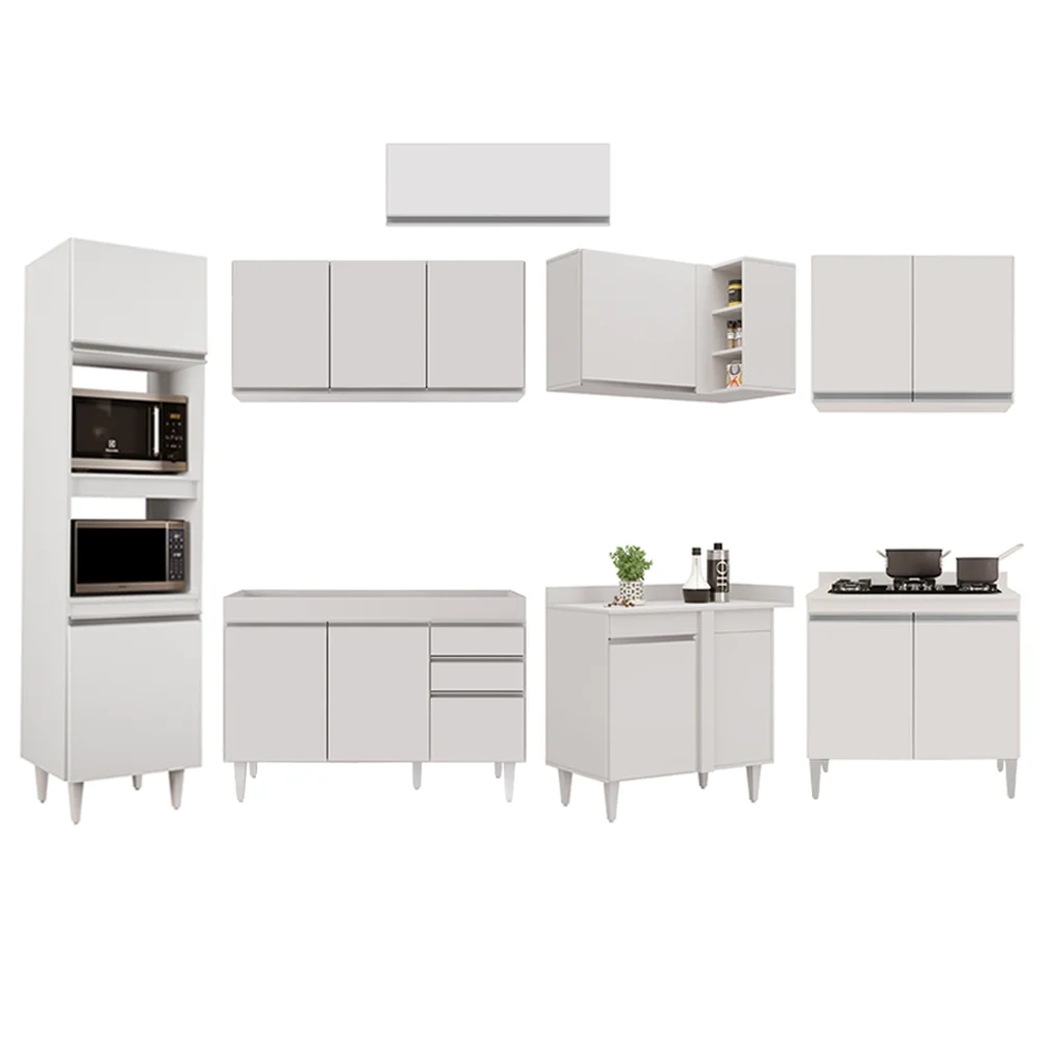 A começar pelo Paneleiro que conta com espaço para micro-ondas e forno elétrico, além de 2 portas para guardar seus utensílios. Na parte inferior você vai contar com 3 Balcões, o Balcão para Pia de 120cm sem tampo é versátil e pode ser personalizado com pia de inox ou granito, de acordo com a sua preferência, o Balcão 80cm com tampo possui 2 Portas e o Balcão de Canto com tampo auxilia na otimização do espaço para aproveitar todos os cantos do ambiente! Já na parte superior, você vai dispor de 4 Armários aéreos, Armário de Geladeira 70cm com porta basculante é prático e funcional, Armário 120cm que conta com 3 portas, Armário 80cm com 2 portas e Armário de Canto com 1 Porta e nichos.