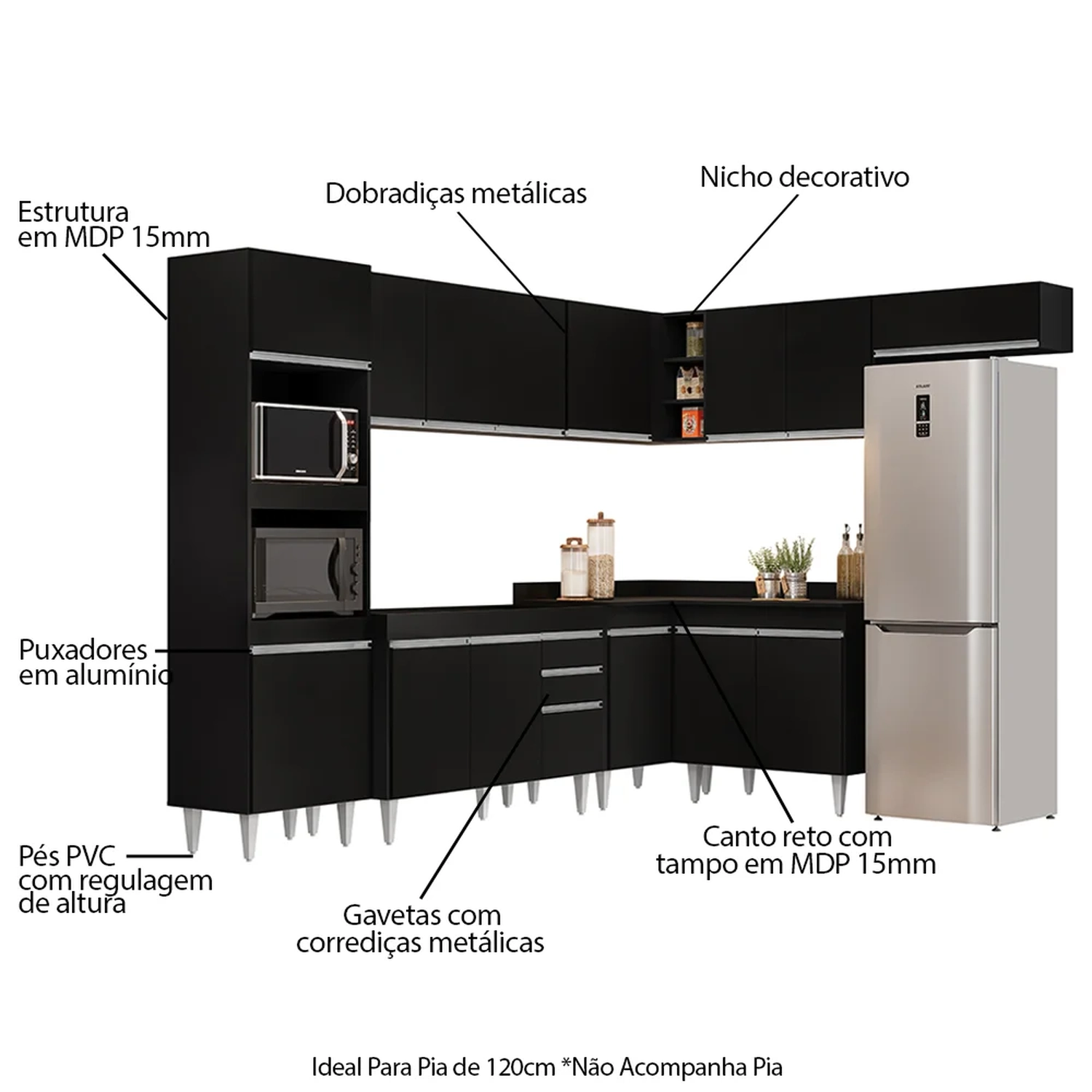 A começar pelo Paneleiro que conta com espaço para micro-ondas e forno elétrico, além de 2 portas para guardar seus utensílios. Na parte inferior você vai contar com 3 Balcões, o Balcão para Pia de 120cm sem tampo é versátil e pode ser customizado com pia de inox ou granito, de acordo com a sua preferência, o Balcão 80cm com tampo possui 2 Portas e o Balcão de Canto com tampo auxilia na otimização do espaço para aproveitar todos os cantos do ambiente! Já na parte superior, você vai dispor de 4 Armários aéreos, Armário de Geladeira 70cm com porta basculante é prático e funcional, Armário 120cm que conta com 3 portas, Armário 80cm com 2 portas e Armário de Canto com 1 Porta e nichos.