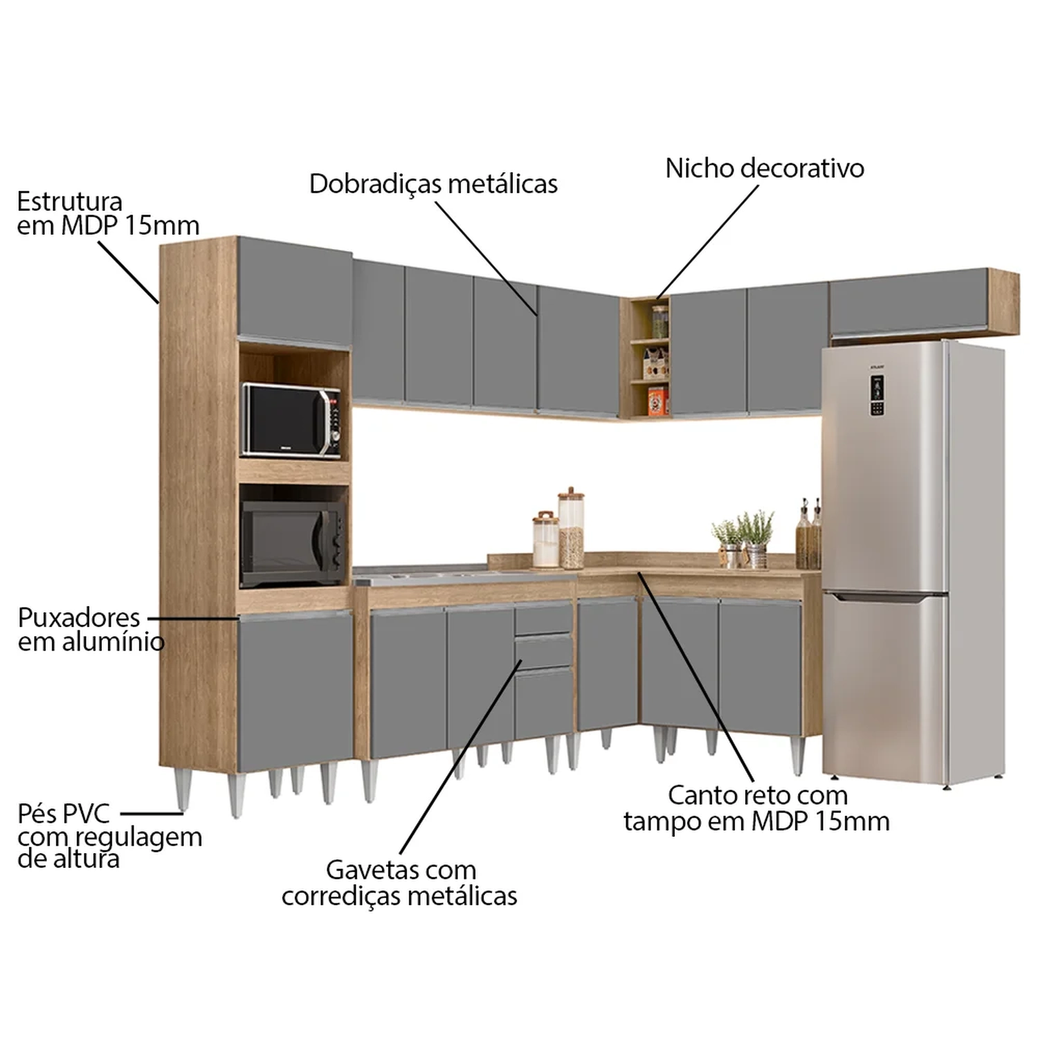 A começar pelo Paneleiro que conta com espaço para micro-ondas e forno elétrico, além de 2 portas para guardar seus utensílios. Na parte inferior você vai contar com 3 Balcões, o Balcão Gabinete 120cm com Pia Inox que possui espelho traseiro concretado e é resistente e fácil de limpar, o Balcão 80cm com tampo 2 Portas e o Balcão de Canto com tampo auxiliam na otimização do espaço para aproveitar todos os cantos do ambiente! Já na parte superior, você vai dispor de 4 Armários aéreos, Armário de Geladeira 70cm com porta basculante é prático e funcional, Armário 120cm com 3 portas, Armário 80cm com 2 portas e Armário de Canto com 1 Porta e nichos.