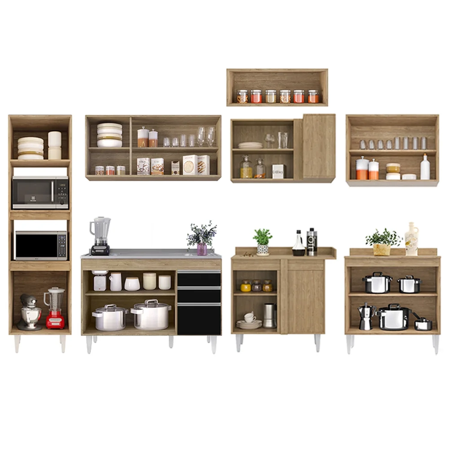 Praticidade, organização e beleza são as palavras que definem o Armário de Cozinha Modulada de Canto 8 Peças CP03 com Pia Inox Castanho/Preto, da Lumil, confira os detalhes!