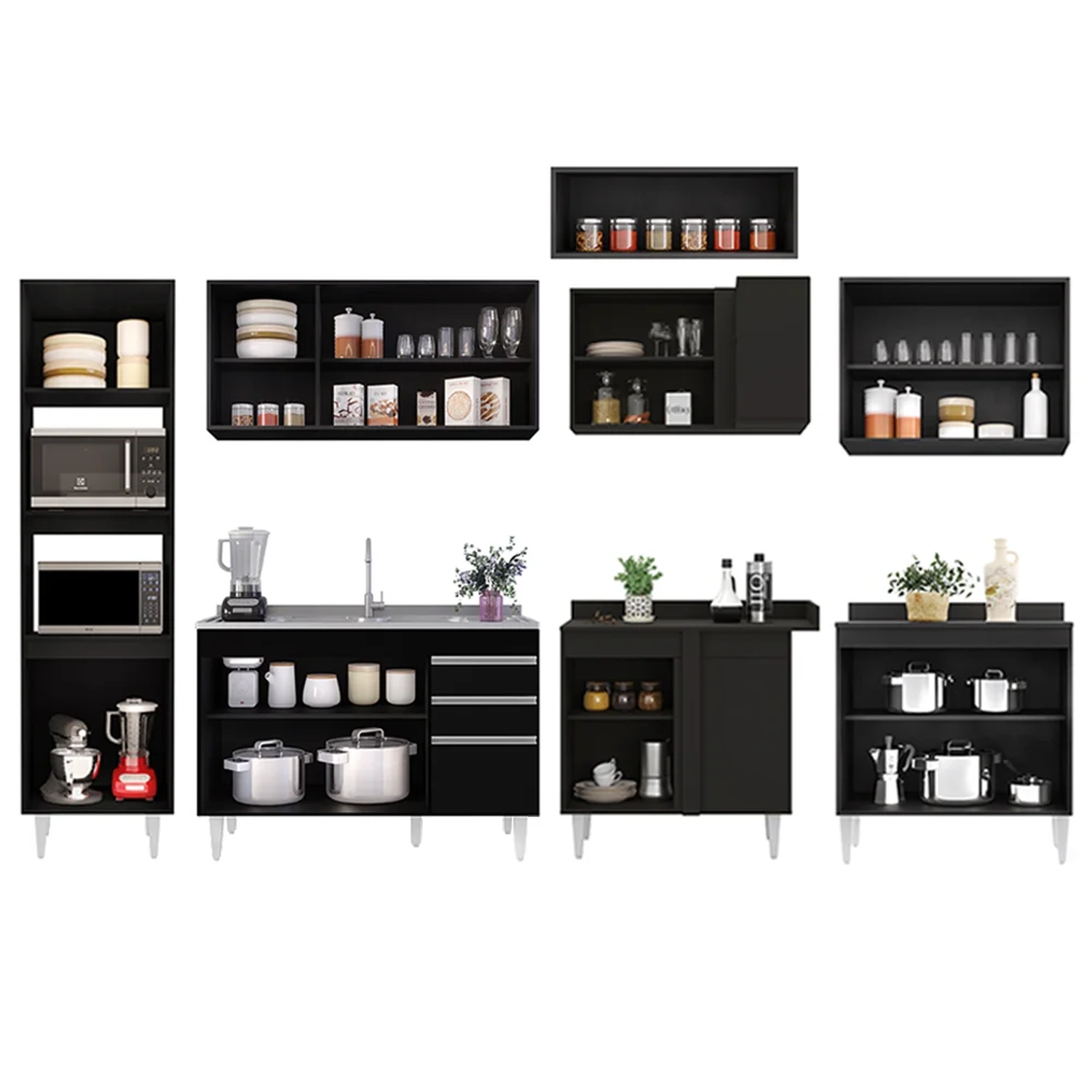 Praticidade, organização e beleza são as palavras que definem o Armário de Cozinha Modulada de Canto 8 Peças CP03 com Pia Inox Preto, da Lumil, confira os detalhes!