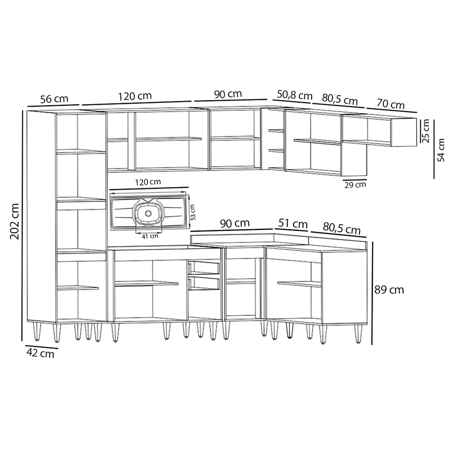 A começar pelo Paneleiro que conta com espaço para micro-ondas e forno elétrico, além de 2 portas para guardar seus utensílios. Na parte inferior você vai contar com 3 Balcões, o Balcão Gabinete 120cm com Pia Inox que possui espelho traseiro concretado e é resistente e fácil de limpar, o Balcão 80cm com tampo 2 Portas e o Balcão de Canto com tampo auxiliam na otimização do espaço para aproveitar todos os cantos do ambiente! Já na parte superior, você vai dispor de 4 Armários aéreos, Armário de Geladeira 70cm com porta basculante é prático e funcional, Armário 120cm com 3 portas, Armário 80cm com 2 portas e Armário de Canto com 1 Porta e nichos.