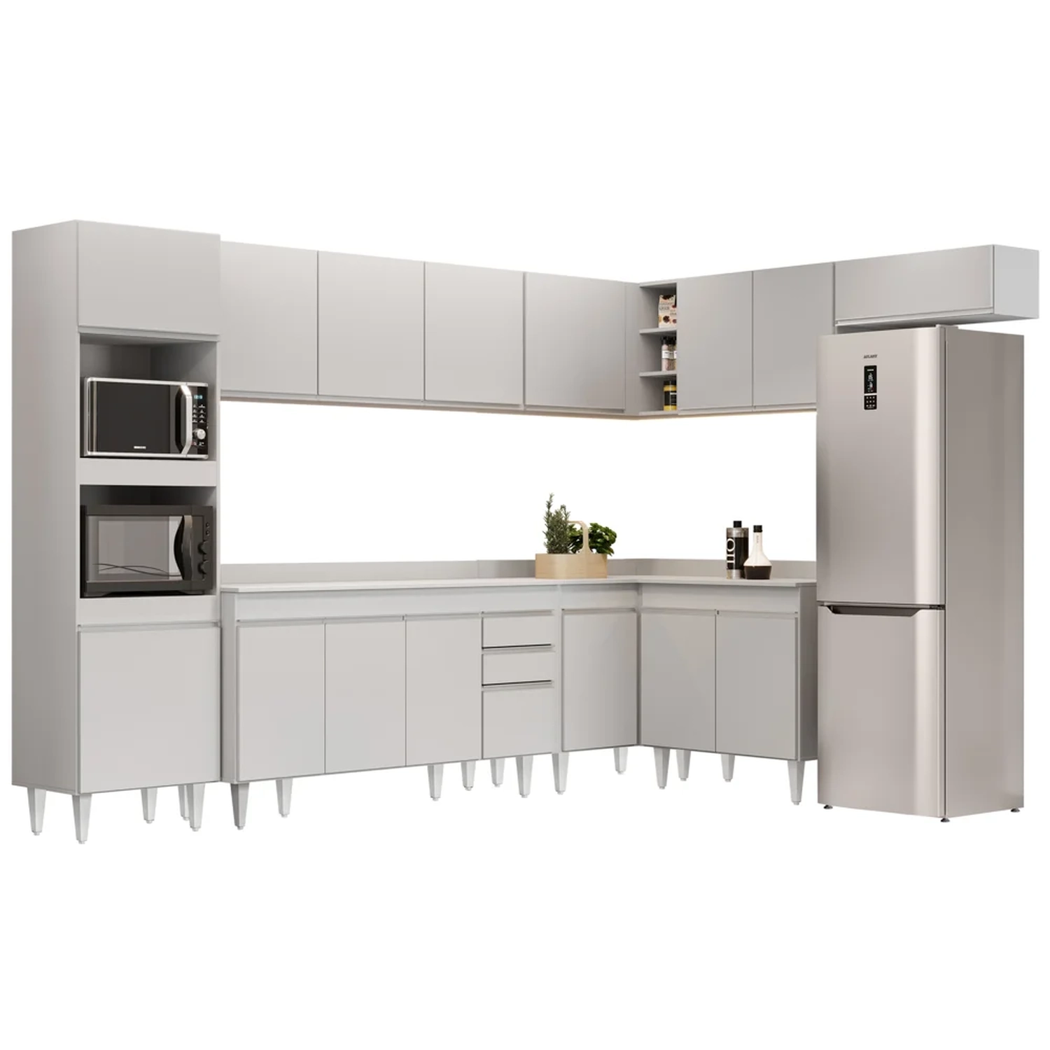 A Cozinha Modulada de Canto possui 8 peças e é composta por 1 Armário e 1 Balcão de Canto, 1 Paneleiro com espaço para forno elétrico e micro-ondas, 1 Balcão 150 com Tampo, 1 Balcão 80cm de 2 portas e 3 Armários Aéreos, que se encaixam perfeitamente no seu espaço e proporcionam organização e conforto.