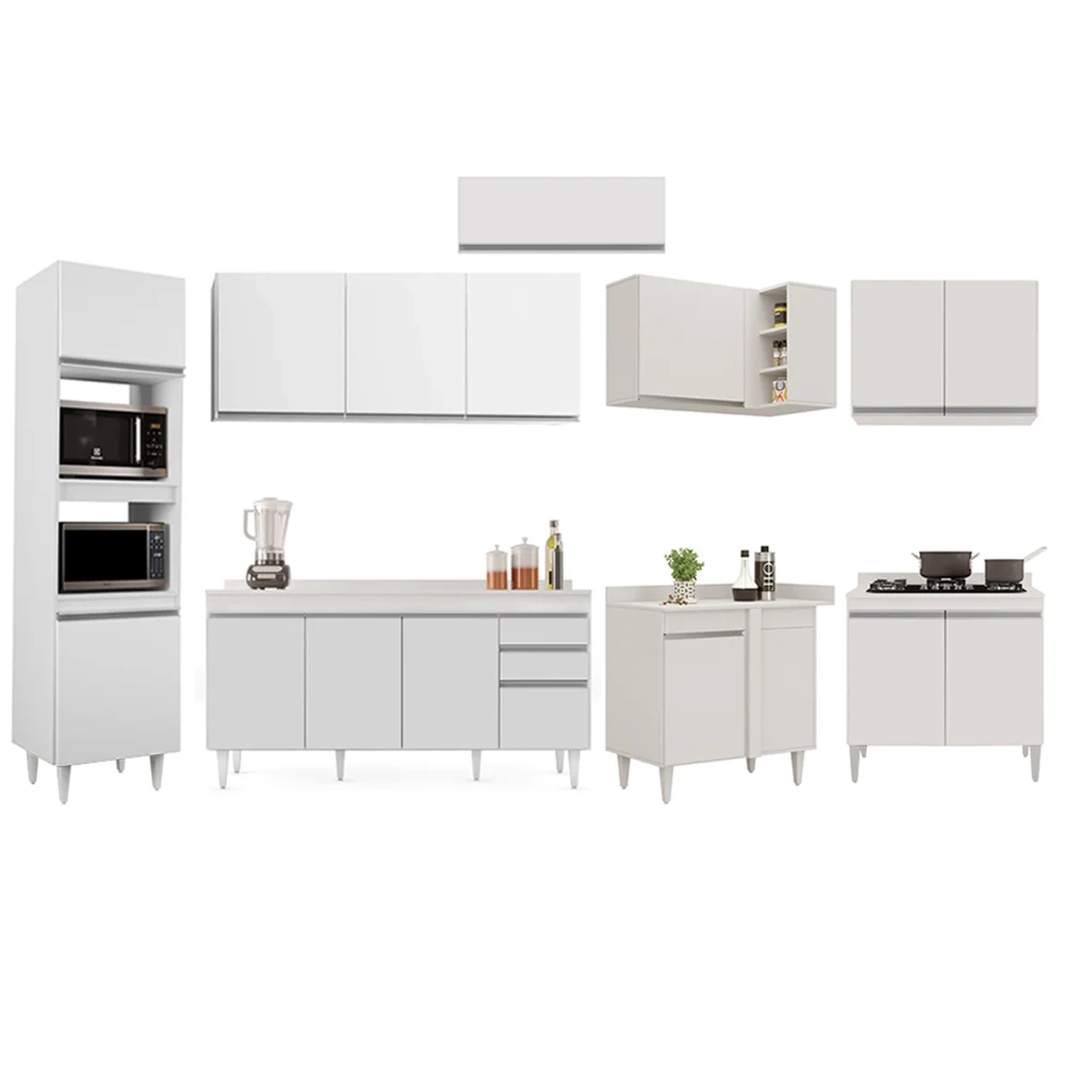 Conteúdo da Embalagem: 1 Tampo 150cm, 1 Balcão 150cm, 1 Balcão 80cm, 1 Armário Aéreo 150cm, 1 Armário Aéreo 80cm, 1 Armário Aéreo 70cm, 1 Balcão de Canto, 1 Armário Aéreo de Canto, 1 Paneleiro.