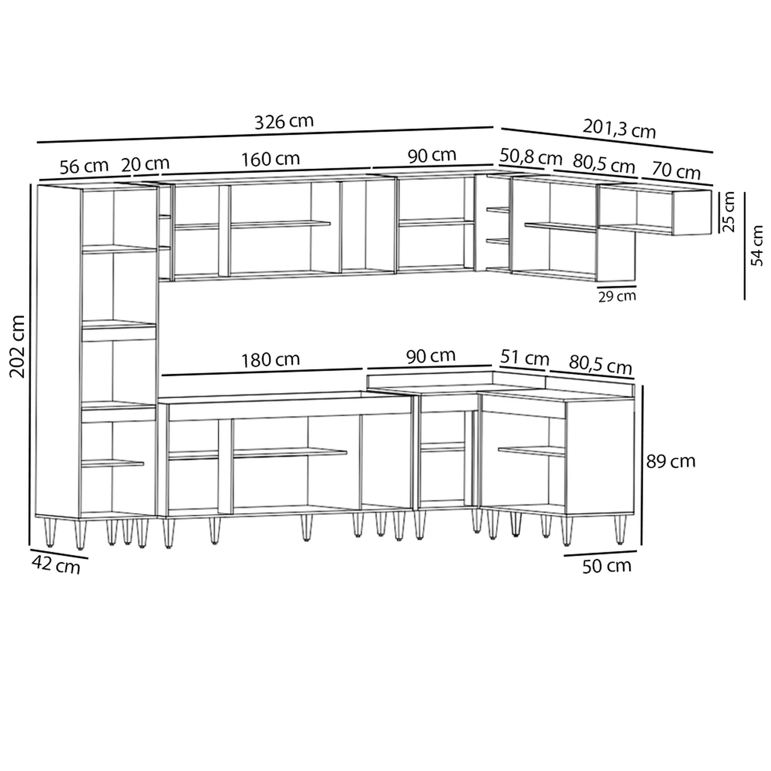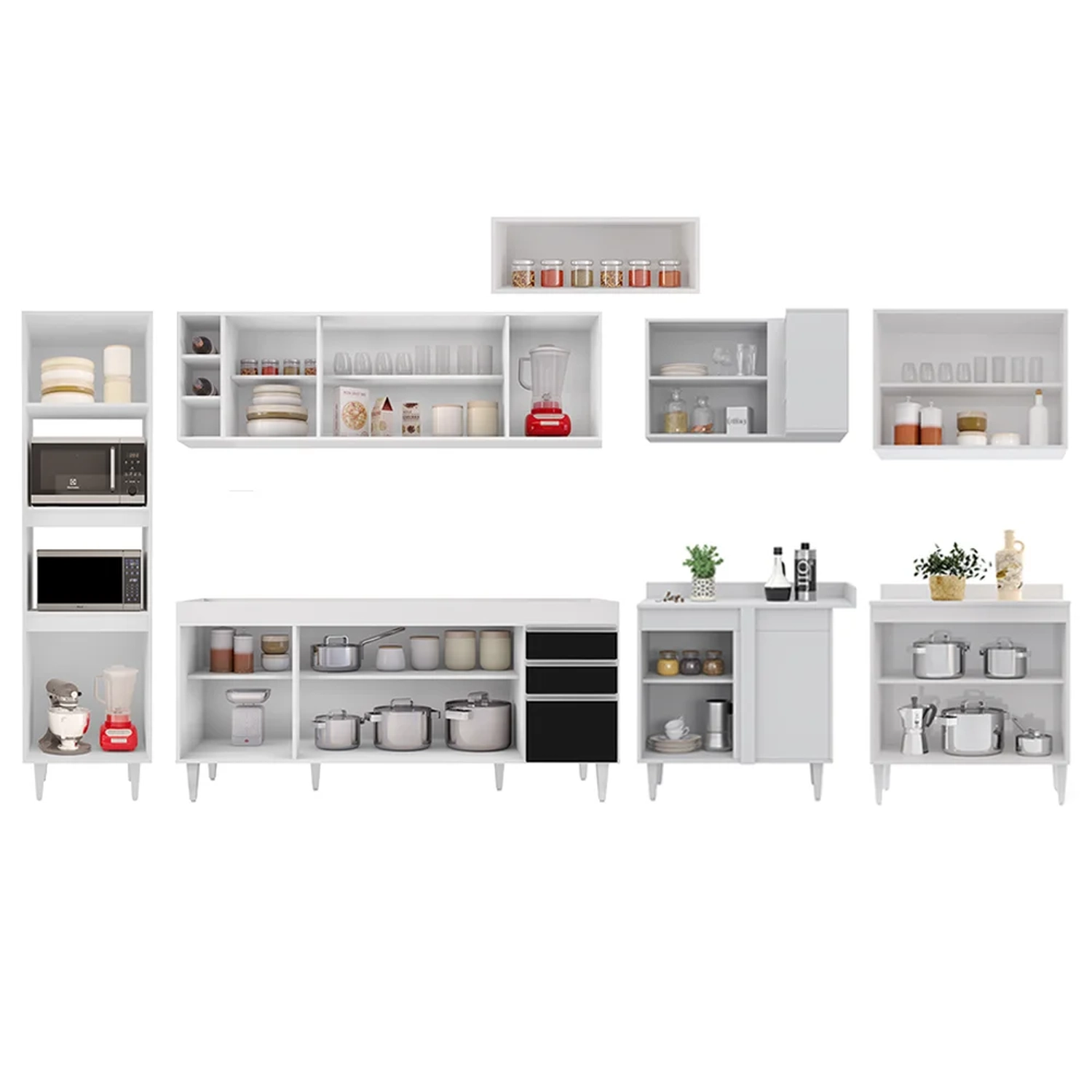 Conteúdo da Embalagem: 1 Balcão 180cm, 1 Armário Aéreo 160cm, 1 Armário Aéreo 70cm, 1 Armário Aéreo 80cm, 1 Balcão 80cm, 1 Nicho, 1 Balcão de canto, 1 Armário Aéreo de Canto, 1 Paneleiro.