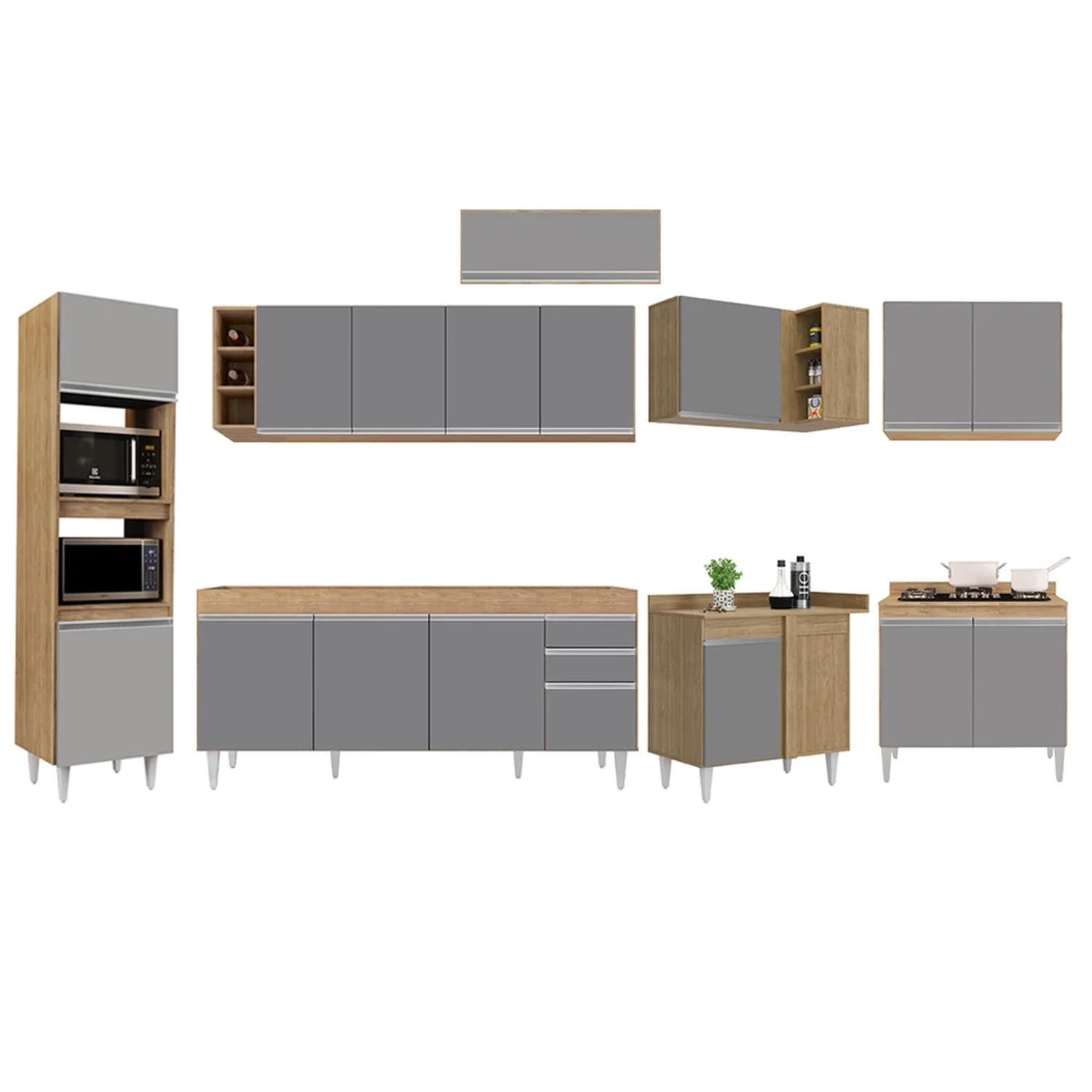 Conteúdo da Embalagem: 1 Balcão 180cm, 1 Armário Aéreo 160cm, 1 Armário Aéreo 70cm, 1 Armário Aéreo 80cm, 1 Balcão 80cm, 1 Nicho, 1 Balcão de canto, 1 Armário Aéreo de Canto, 1 Paneleiro.