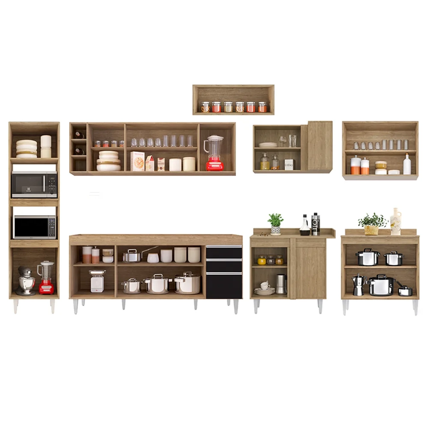 Conteúdo da Embalagem: 1 Balcão 180cm, 1 Armário Aéreo 160cm, 1 Armário Aéreo 70cm, 1 Armário Aéreo 80cm, 1 Balcão 80cm, 1 Nicho, 1 Balcão de canto, 1 Armário Aéreo de Canto, 1 Paneleiro.