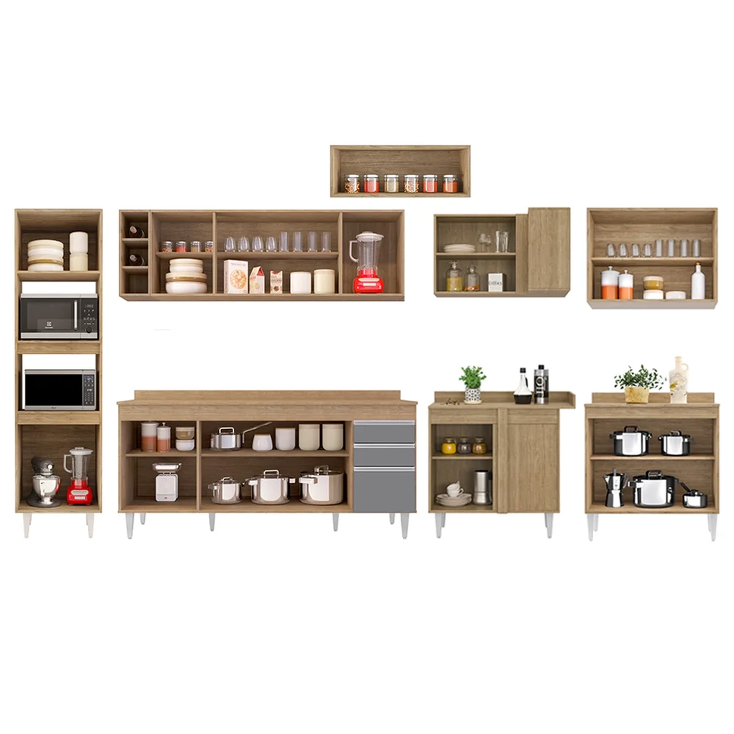 Conteúdo da Embalagem: 1 Balcão 180cm, 1 Tampo 180cm, 1 Armário Aéreo 160cm, 1 Armário Aéreo 70cm, 1 Armário Aéreo 80cm, 1 Balcão 80cm, 1 Nicho, 1 Balcão de canto, 1 Armário Aéreo de Canto, 1 Paneleiro.