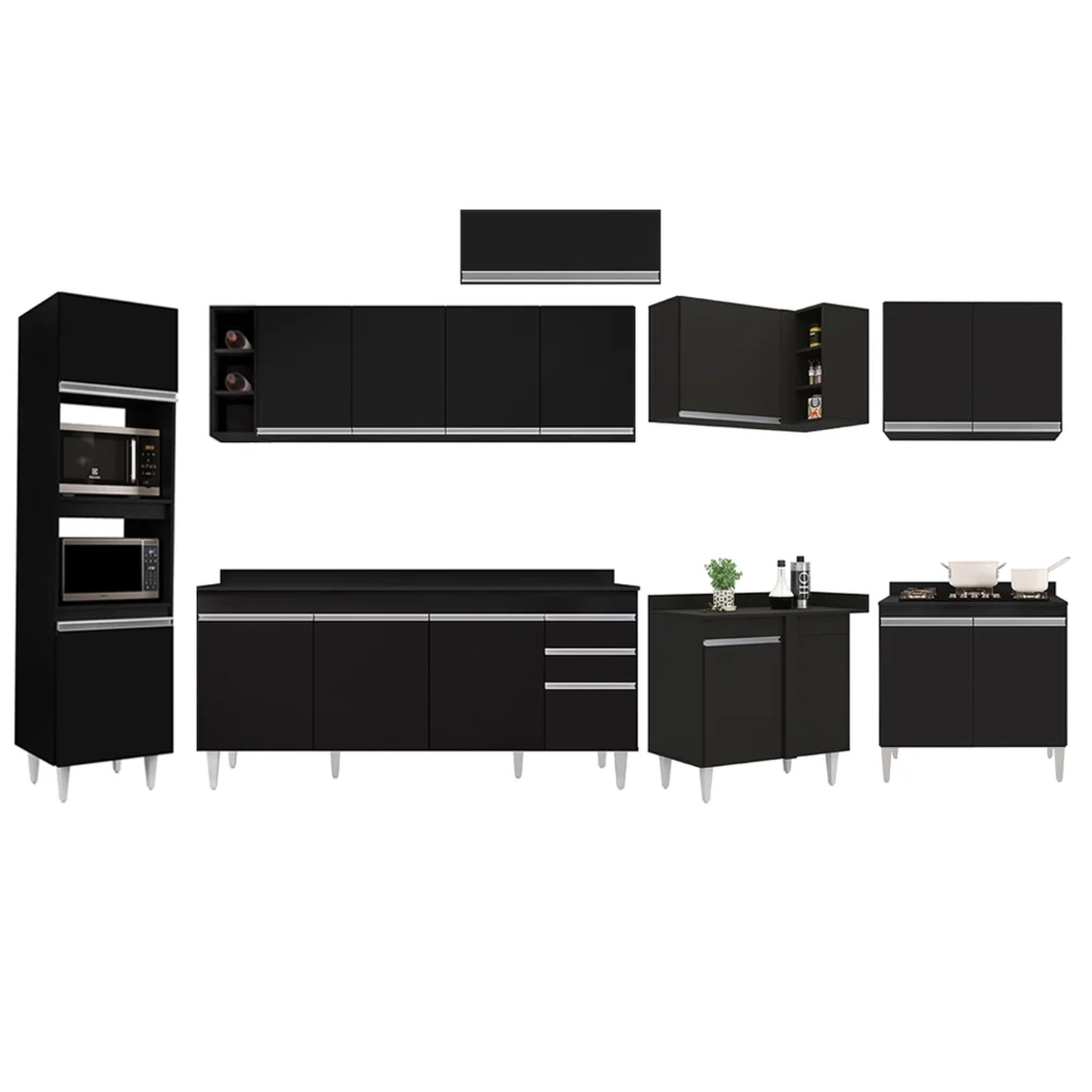 Conteúdo da Embalagem: 1 Balcão 180cm, 1 Tampo 180cm, 1 Armário Aéreo 160cm, 1 Armário Aéreo 70cm, 1 Armário Aéreo 80cm, 1 Balcão 80cm, 1 Nicho, 1 Balcão de canto, 1 Armário Aéreo de Canto, 1 Paneleiro.