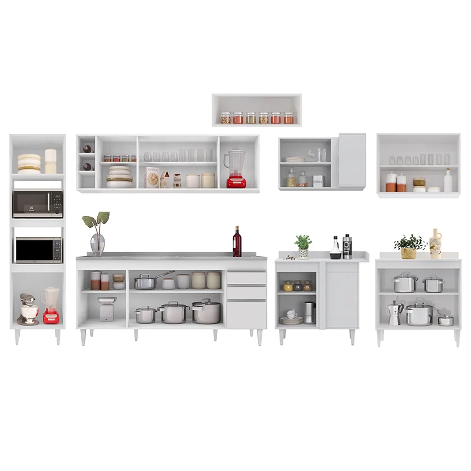Conteúdo da Embalagem: 1 Balcão 180cm, 1 Pia Inox 180cm, 1 Armário Aéreo 160cm, 1 Armário Aéreo 70cm, 1 Armário Aéreo 80cm, 1 Balcão 80cm, 1 Nicho, 1 Balcão de canto, 1 Armário Aéreo de Canto, 1 Paneleiro.