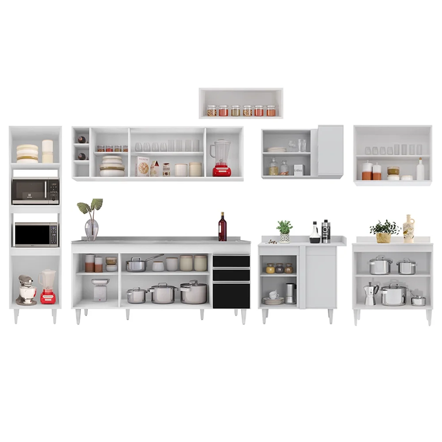 Conteúdo da Embalagem: 1 Balcão 180cm, 1 Pia Inox 180cm, 1 Armário Aéreo 160cm, 1 Armário Aéreo 70cm, 1 Armário Aéreo 80cm, 1 Balcão 80cm, 1 Nicho, 1 Balcão de canto, 1 Armário Aéreo de Canto, 1 Paneleiro.