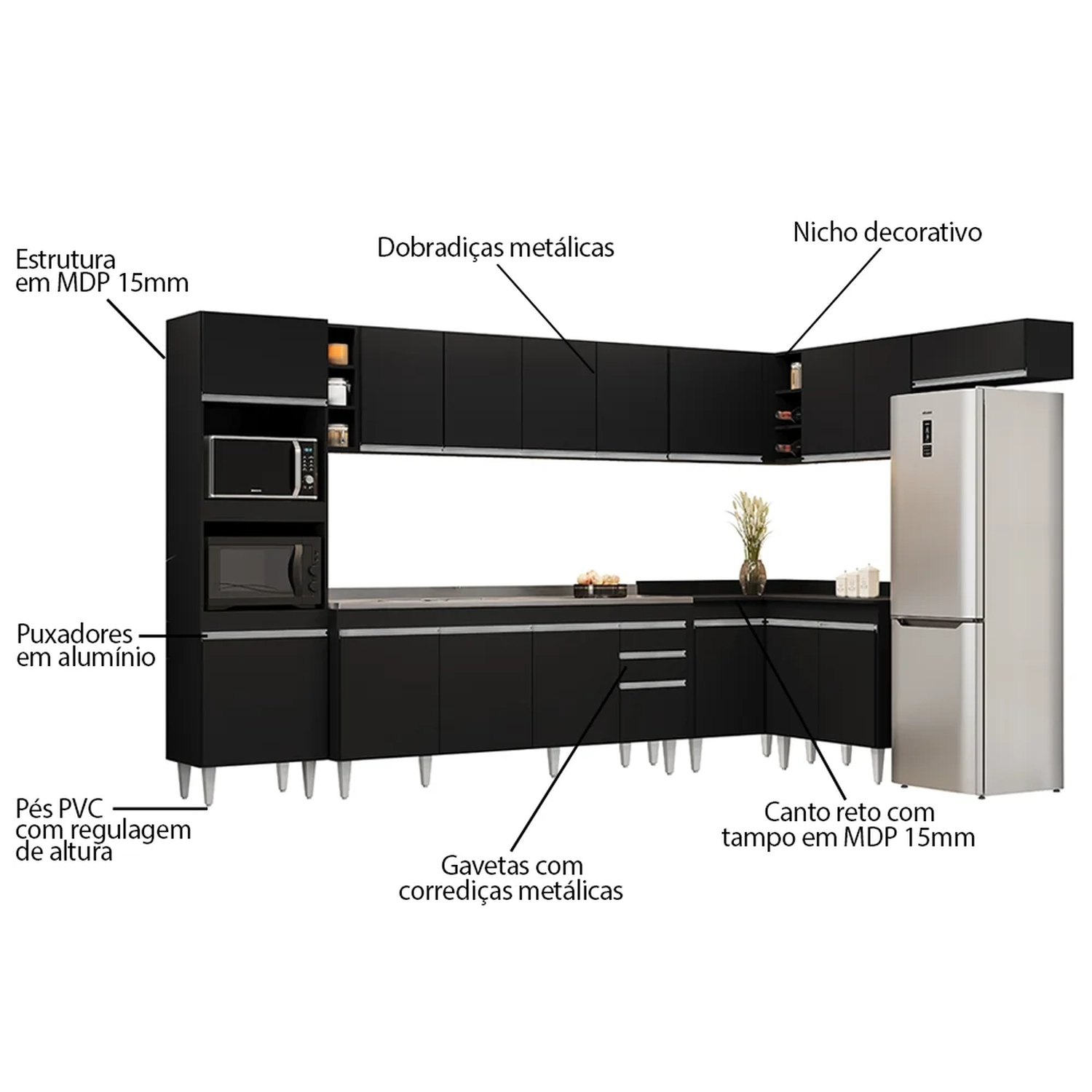 Todos os módulos são produzidos 100% em MDP e possuem um acabamento de alta qualidade em Melamina BP e fita de borda em Papel, que é resistente e garante maior durabilidade ao produto. Ah! Não podemos esquecer dos detalhes que tornam essa Cozinha ainda mais charmosa, todos os puxadores são fabricados em alumínio agregando modernidade aos móveis, as gavetas contam com corrediças metálicas que deslizam suavemente e os pés reguláveis são ideias para corrigir pequenos desníveis de piso.