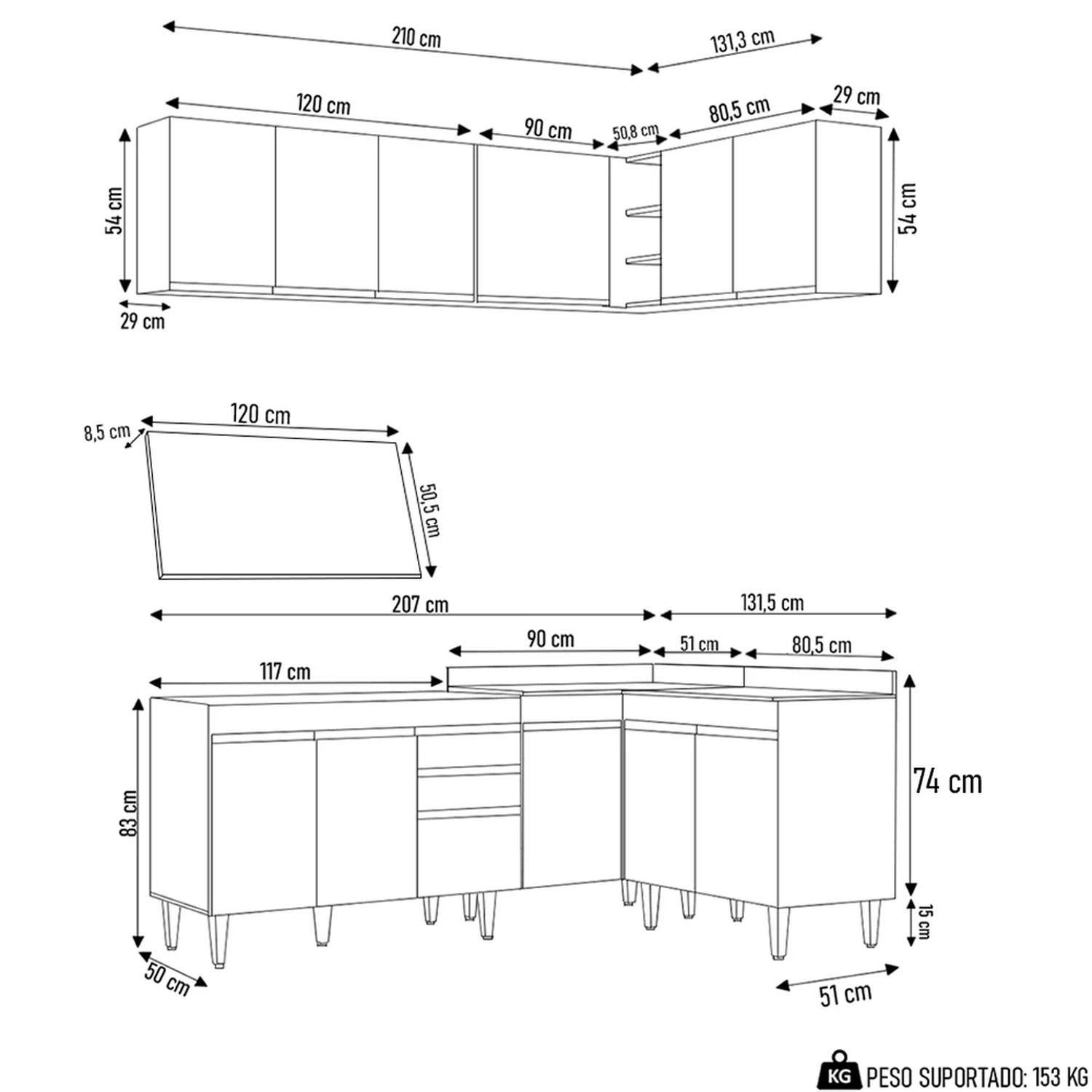 Conteúdo da Embalagem: 1 Balcão 120cm, 1 Armário Aéreo 120cm, 1 Armário Aéreo 80cm, 1 Balcão 80cm, 1 Balcão de canto, 1 Armário Aéreo de Canto, 1 Tampo 120cm.