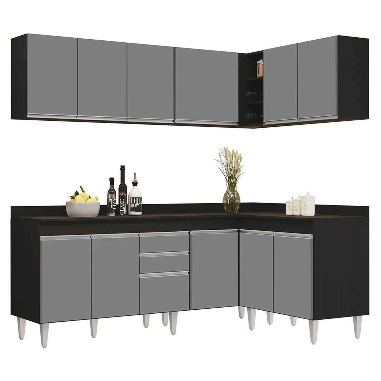 Transforme a sua cozinha em um ambiente prático e funcional com o Armário de Cozinha Modulado de Canto 6 Peças CP29 Balcão com Tampo Preto/Cinza, da Lumil, você terá tudo o que precisa ao seu alcance. Composto por 6 peças inteligentemente projetadas com balcão gabinete com tampo, armários aéreos, balcão de canto e balcão 2 portas, esse armário modulado oferece uma distribuição interna perfeita para organizar todos os seus utensílios.