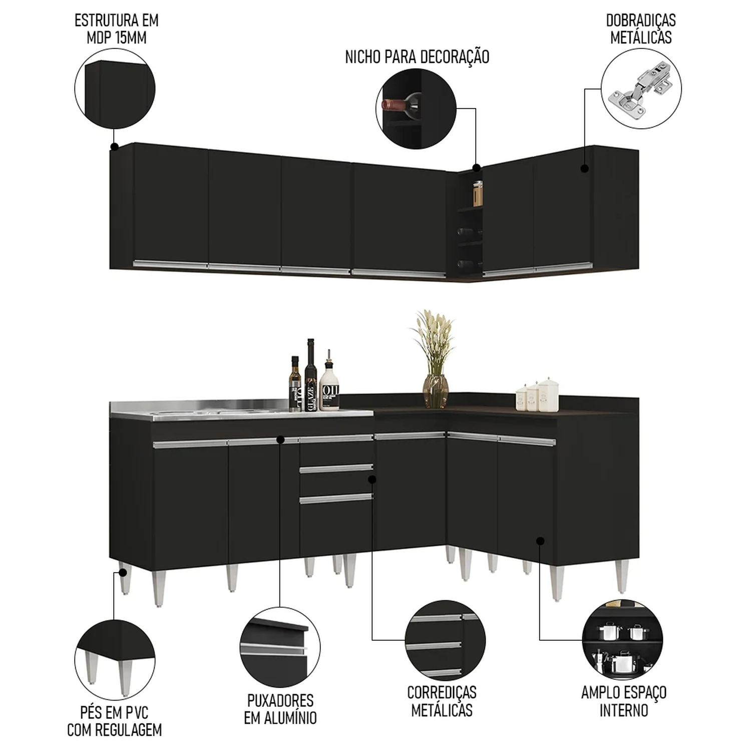 Conteúdo da Embalagem: 1 Balcão 120cm, 1 Armário Aéreo 120cm, 1 Armário Aéreo 80cm, 1 Balcão 80cm, 1 Balcão de canto, 1 Armário Aéreo de Canto, 1 Pia Inox 120cm.
