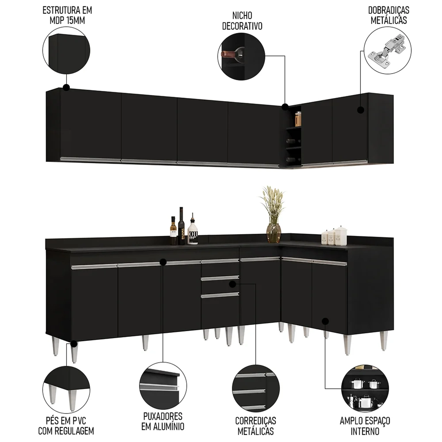 Procura uma cozinha prática e funcional?! Então, acaba de encontrar. Com o Armário de Cozinha Modulado de Canto 6 Peças CP32 Balcão com Tampo Preto, da Lumil, você terá tudo o que precisa ao seu alcance. Composto por 6 peças inteligentemente projetadas, esse armário modulado oferece uma distribuição interna perfeita para organizar todos os seus utensílios.