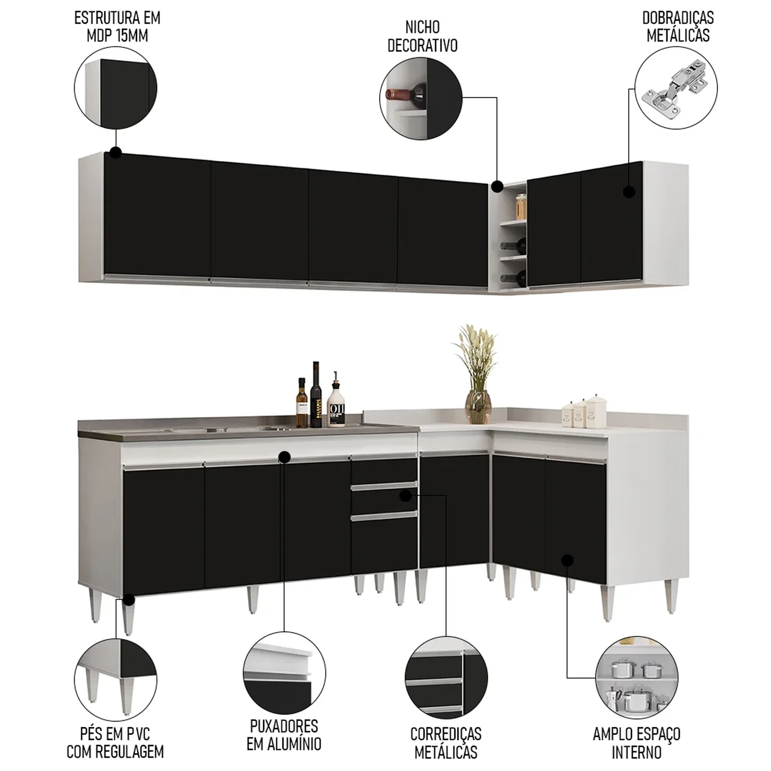 Além de ser composto por peças essenciais, como balcão para pia 150cm, armários aéreos, balcão de canto e balcão 2 portas, esse jogo de cozinha completo ainda conta com uma maior resistência contra riscos e umidade, garantindo sua durabilidade por muito tempo, graças ao acabamento em BP. Já os pés ajustáveis permitem você nivelar o móvel em qualquer tipo de piso. Para completar, o design contemporâneo dessa cozinha de canto se adapta facilmente a qualquer estilo de decoração, ao passo que a configuração de canto otimiza a circulação no ambiente.