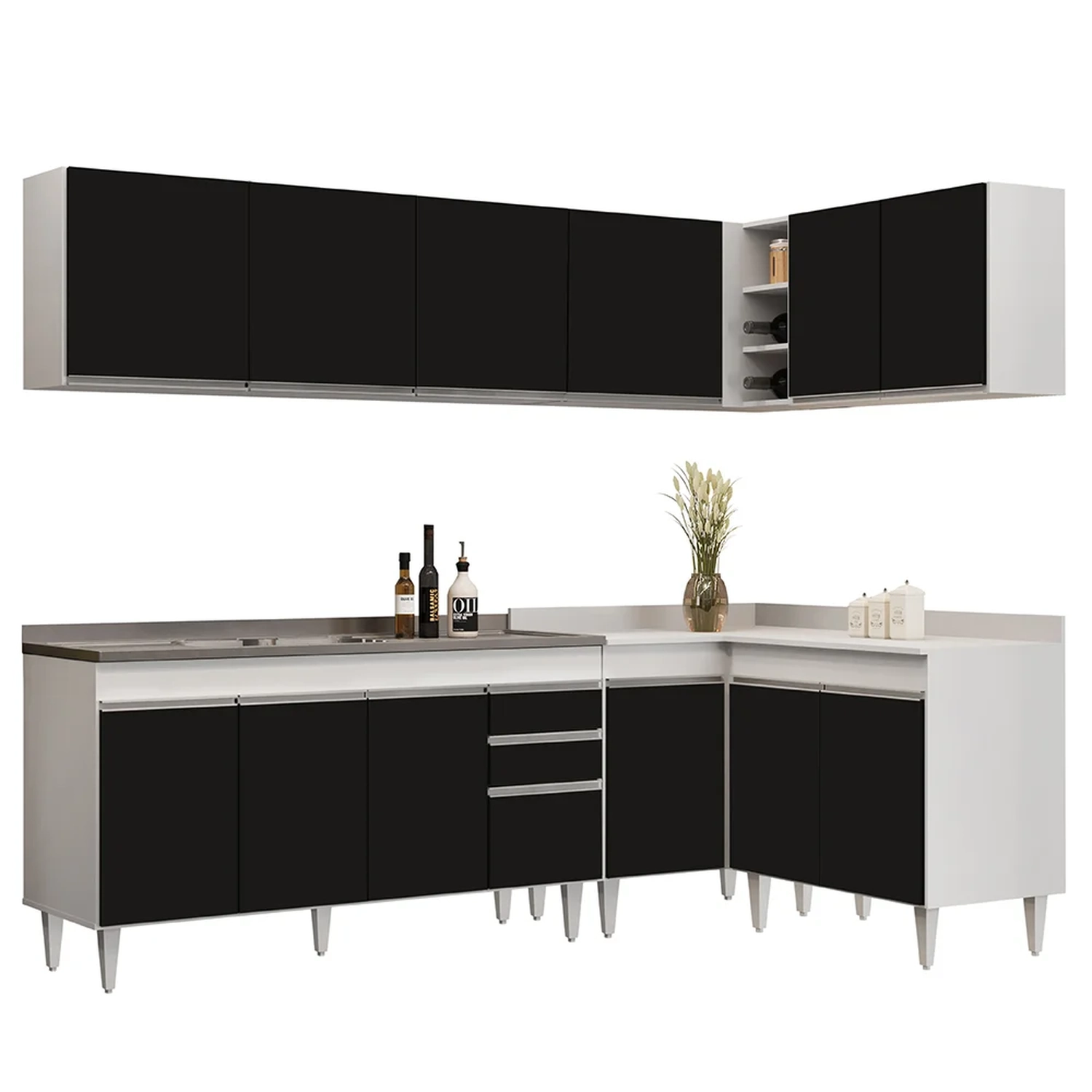 Procura uma cozinha prática e funcional?! Então, acaba de encontrar. Com o Armário de Cozinha Modulado de Canto 6 Peças CP33 com Pia Inox Branco/Preto, da Lumil, você terá tudo o que precisa ao seu alcance. Composto por 6 peças inteligentemente projetadas, esse armário modulado oferece uma distribuição interna perfeita para organizar todos os seus utensílios.