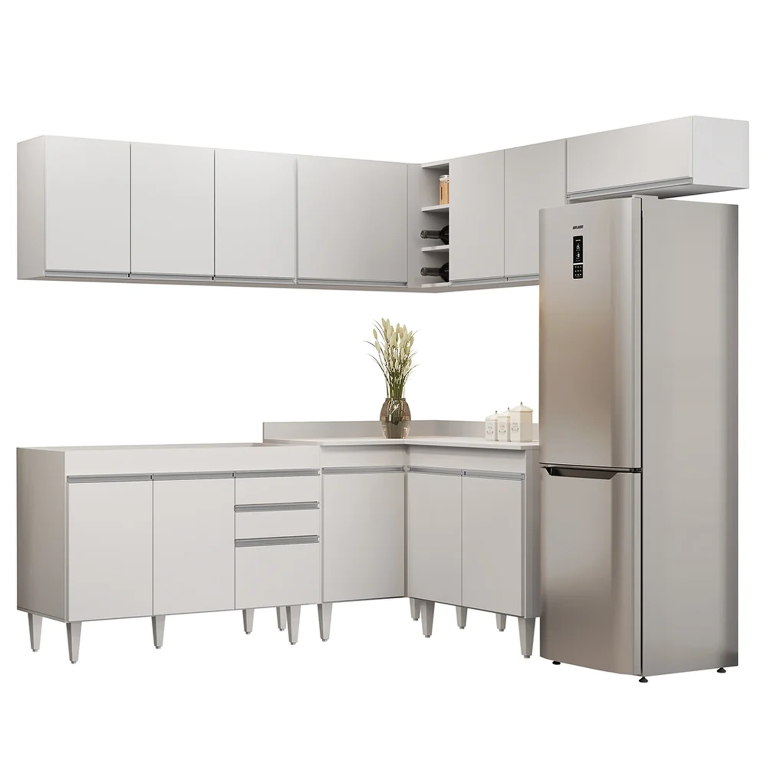 Além disso, o acabamento BP confere a esse jogo de cozinha completo uma maior resistência contra riscos e umidade, garantindo sua durabilidade por muito tempo. Já os pés ajustáveis permitem que você nivelar o móvel em qualquer tipo de piso. Para completar, o design contemporâneo dessa cozinha de canto se adapta facilmente a qualquer estilo de decoração, ao passo que a configuração de canto otimiza a circulação no ambiente.