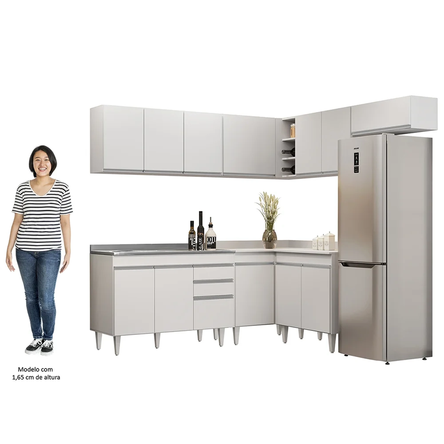 Conteúdo da Embalagem: 1 Balcão 120cm, 1 Armário Aéreo 120cm, 1 Armário Aéreo 70cm, 1 Armário Aéreo 80cm, 1 Balcão 80cm, 1 Balcão de canto, 1 Armário Aéreo de Canto, 1 Pia Inox 120cm.