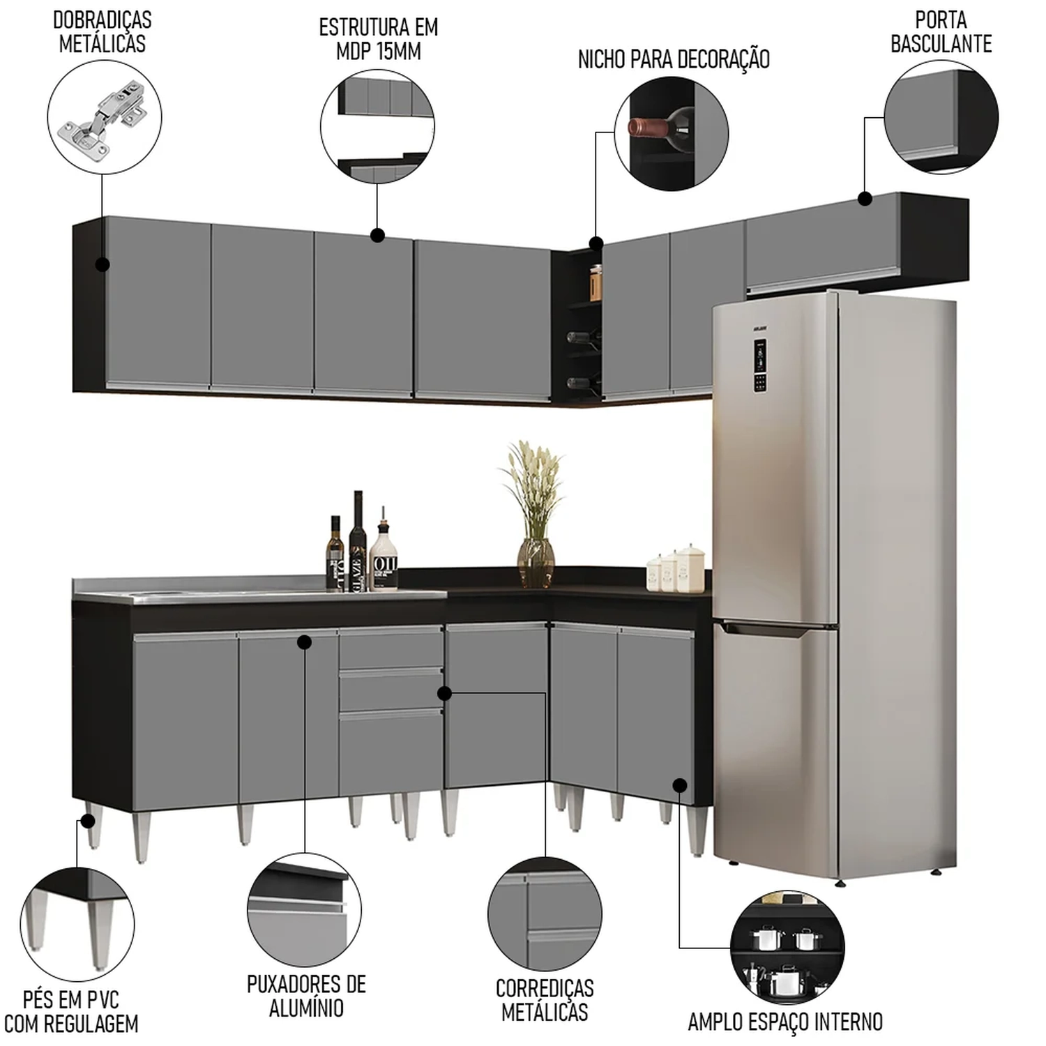 Você merece uma cozinha prática e funcional! Com o Armário de Cozinha Modulado de Canto 7 Peças CP21 com Pia Inox Preto/Cinza, da Lumil, você terá tudo o que precisa ao seu alcance. Composto por 7 peças inteligentemente projetadas com balcão para pia, armários aéreos, nicho garrafeiro, balcão de canto, e balcão 2 portas, esse armário modulado oferece uma distribuição interna perfeita para organizar todos os seus utensílios.