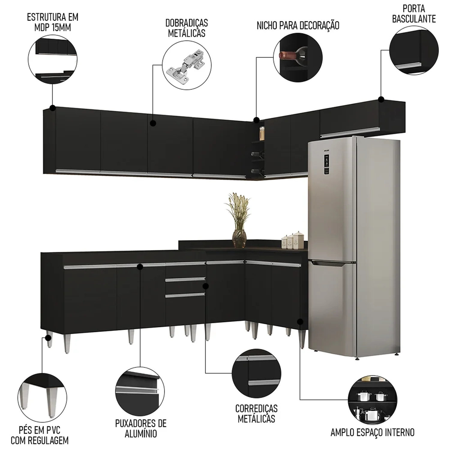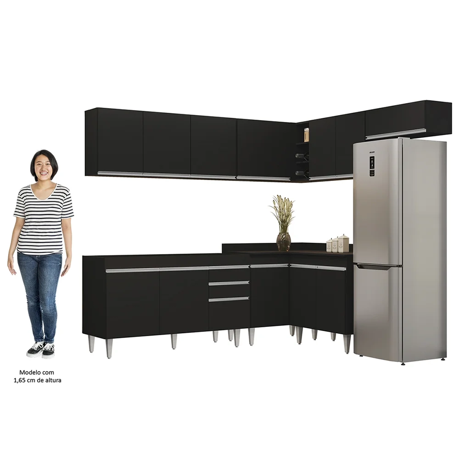 Conteúdo da Embalagem: 1 Balcão 150cm, 1 Armário Aéreo 150cm, 1 Armário Aéreo 70cm, 1 Armário Aéreo 80cm, 1 Balcão 80cm, 1 Balcão de canto, 1 Armário Aéreo de Canto.