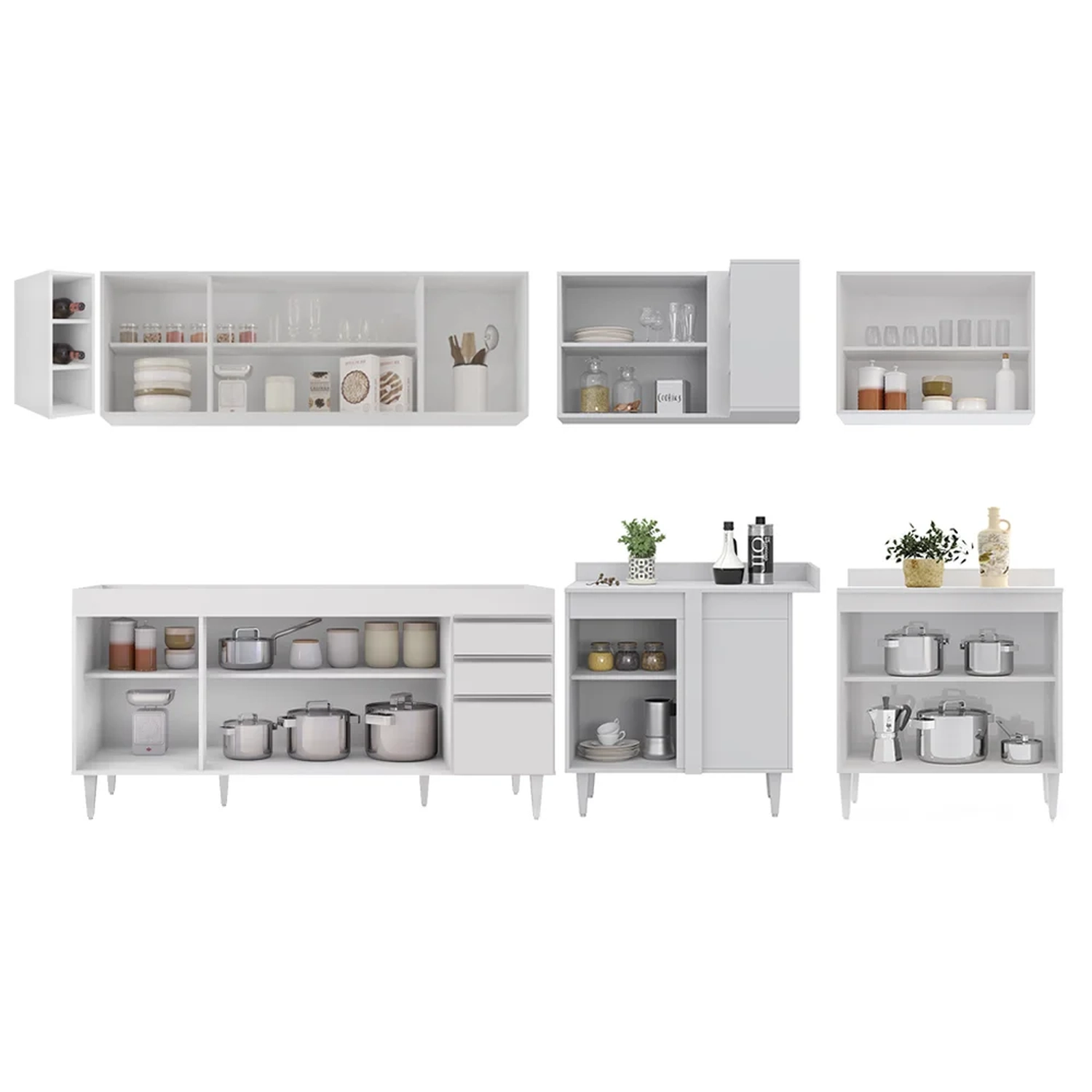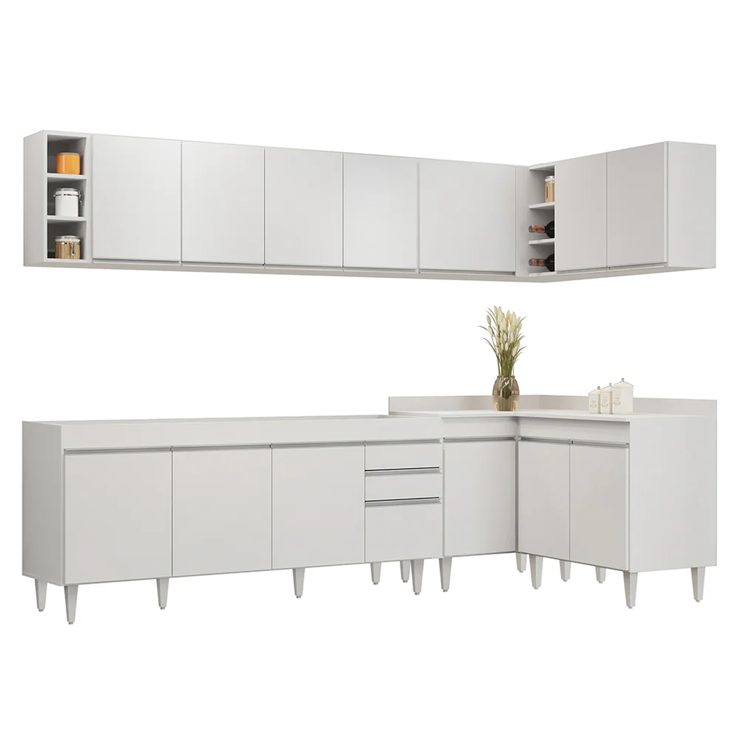 Conteúdo da Embalagem: 1 Balcão 180cm, 1 Armário Aéreo 160cm, 1 Armário Aéreo 80cm, 1 Balcão 80cm, 1 Balcão de canto, 1 Armário Aéreo de Canto, 1 Nicho.