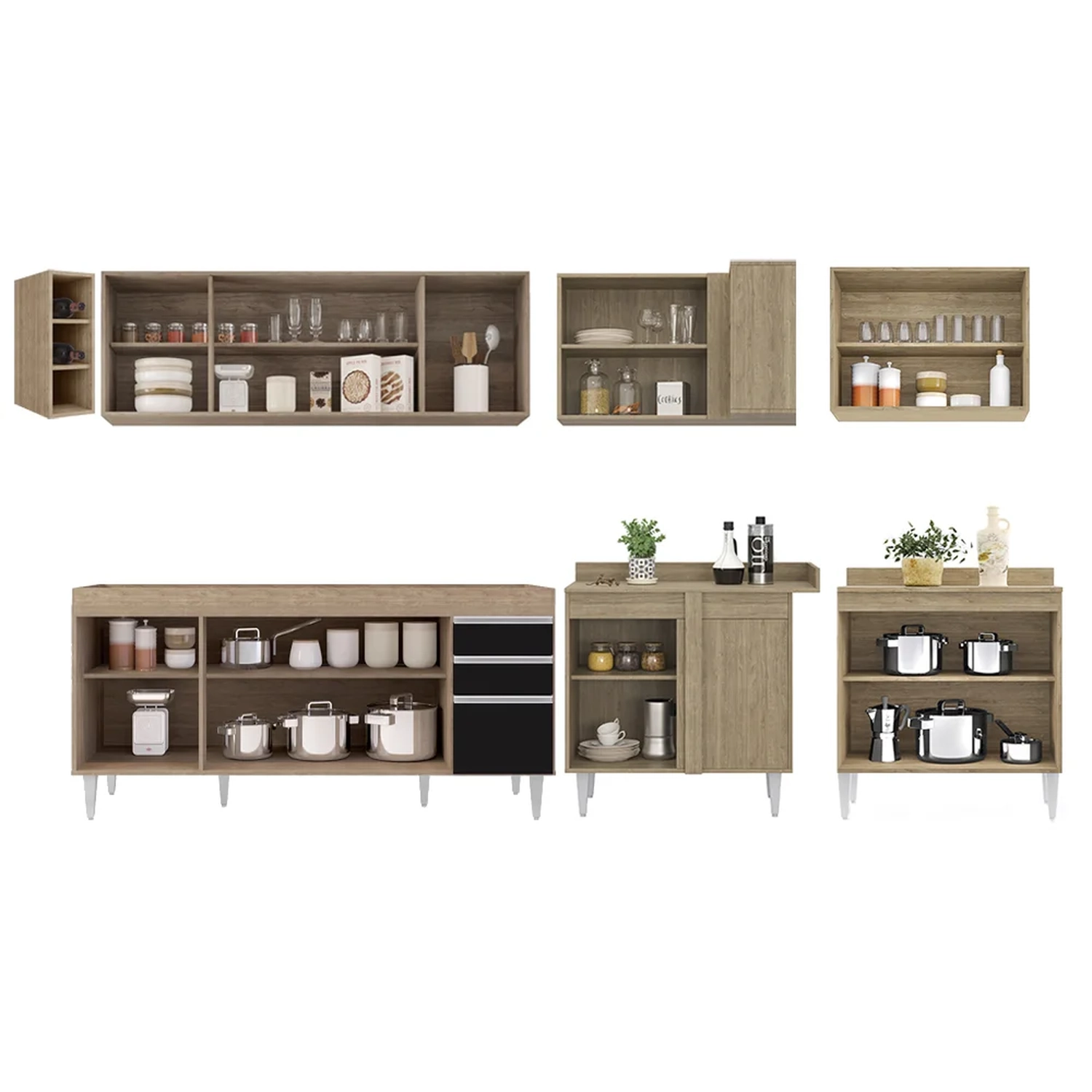 Conteúdo da Embalagem: 1 Balcão 180cm, 1 Armário Aéreo 160cm, 1 Armário Aéreo 80cm, 1 Balcão 80cm, 1 Balcão de canto, 1 Armário Aéreo de Canto, 1 Nicho.