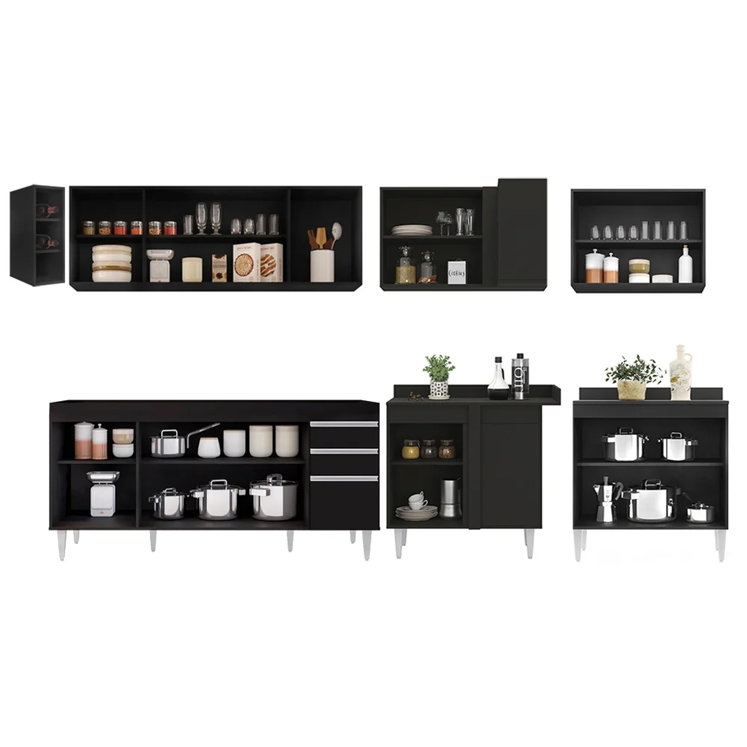 Conteúdo da Embalagem: 1 Balcão 180cm, 1 Armário Aéreo 160cm, 1 Armário Aéreo 80cm, 1 Balcão 80cm, 1 Balcão de canto, 1 Armário Aéreo de Canto, 1 Nicho.