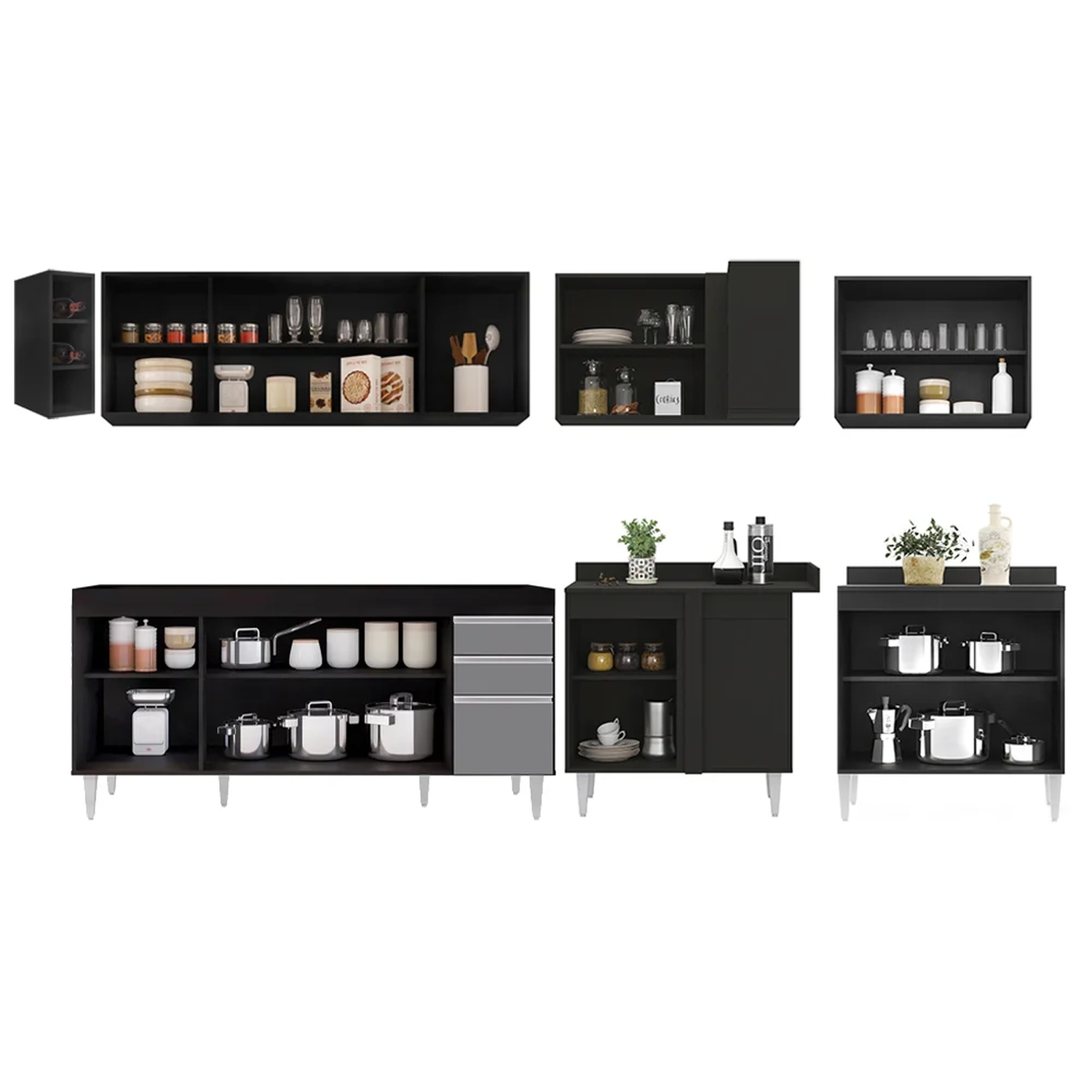 Conteúdo da Embalagem: 1 Balcão 180cm, 1 Armário Aéreo 160cm, 1 Armário Aéreo 80cm, 1 Balcão 80cm, 1 Balcão de canto, 1 Armário Aéreo de Canto, 1 Nicho.