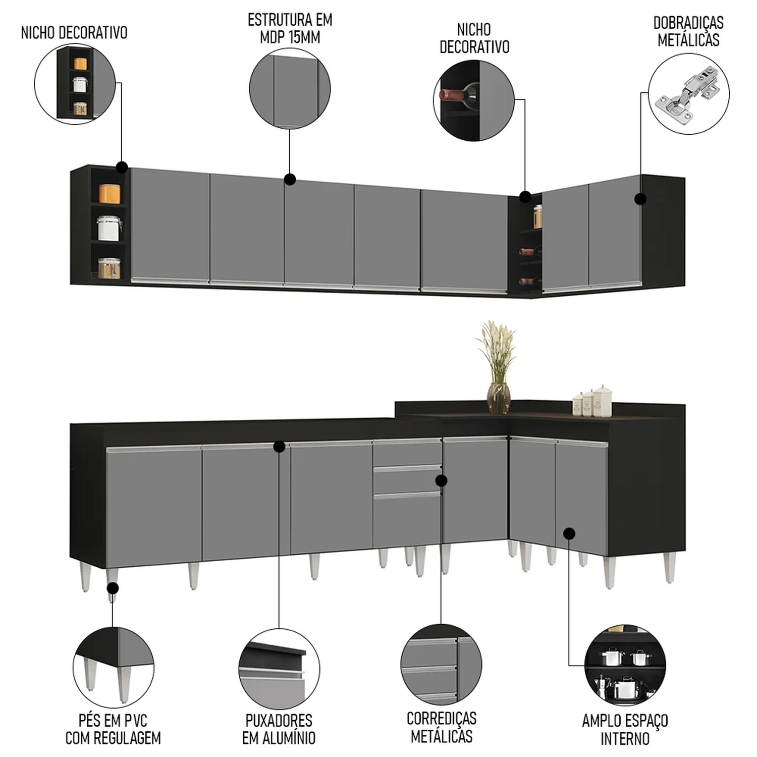 Renove a sua cozinha com o Armário de Cozinha Modulado de Canto 7 Peças CP34 Balcão sem Tampo Preto/Cinza, da Lumil, você terá tudo o que precisa ao seu alcance. Composto por 7 peças inteligentemente projetadas, esse armário modulado oferece uma distribuição interna perfeita para organizar todos os seus utensílios.