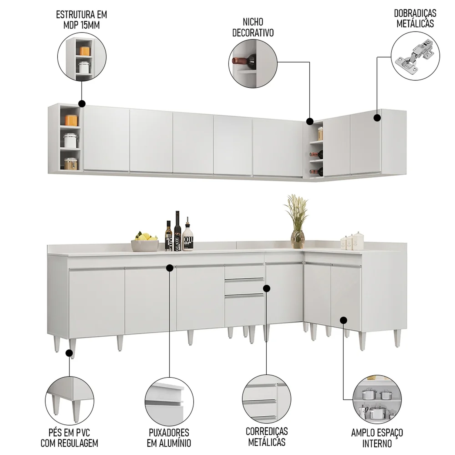 Conteúdo da Embalagem: 1 Balcão 180cm, 1 Armário Aéreo 160cm, 1 Armário Aéreo 80cm, 1 Balcão 80cm, 1 Balcão de canto, 1 Armário Aéreo de Canto, 1 Nicho, 1 Tampo 180cm.