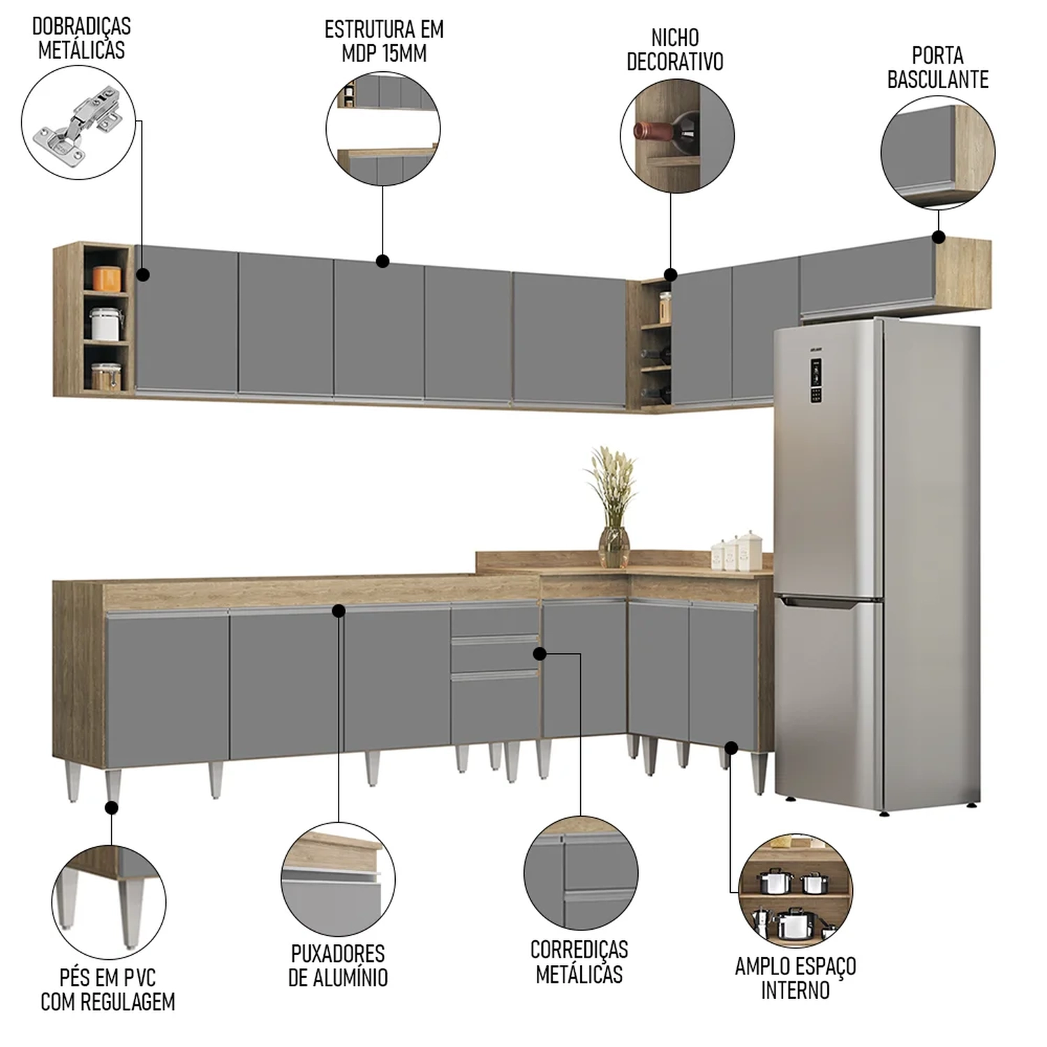 Além de ser composto por peças essenciais, como balcão para pia 180cm, armários aéreos, balcão de canto, nicho garrafeiro e balcão 2 portas, esse jogo de cozinha completo ainda conta com uma maior resistência contra riscos e umidade, garantindo sua durabilidade por muito tempo, graças ao acabamento em BP. Já os pés ajustáveis permitem você nivelar o móvel em qualquer tipo de piso. Para completar, o design contemporâneo dessa cozinha de canto se adapta facilmente a qualquer estilo de decoração, ao passo que a configuração de canto otimiza a circulação no ambiente.