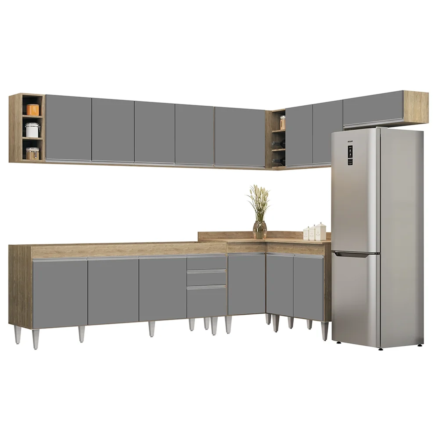 Renove a sua cozinha com o Armário de Cozinha Modulado de Canto 8 Peças CP25 Balcão sem Tampo Castanho/Cinza, da Lumil, você terá tudo o que precisa ao seu alcance. Composto por 8 peças inteligentemente projetadas, esse armário modulado oferece uma distribuição interna perfeita para organizar todos os seus utensílios.